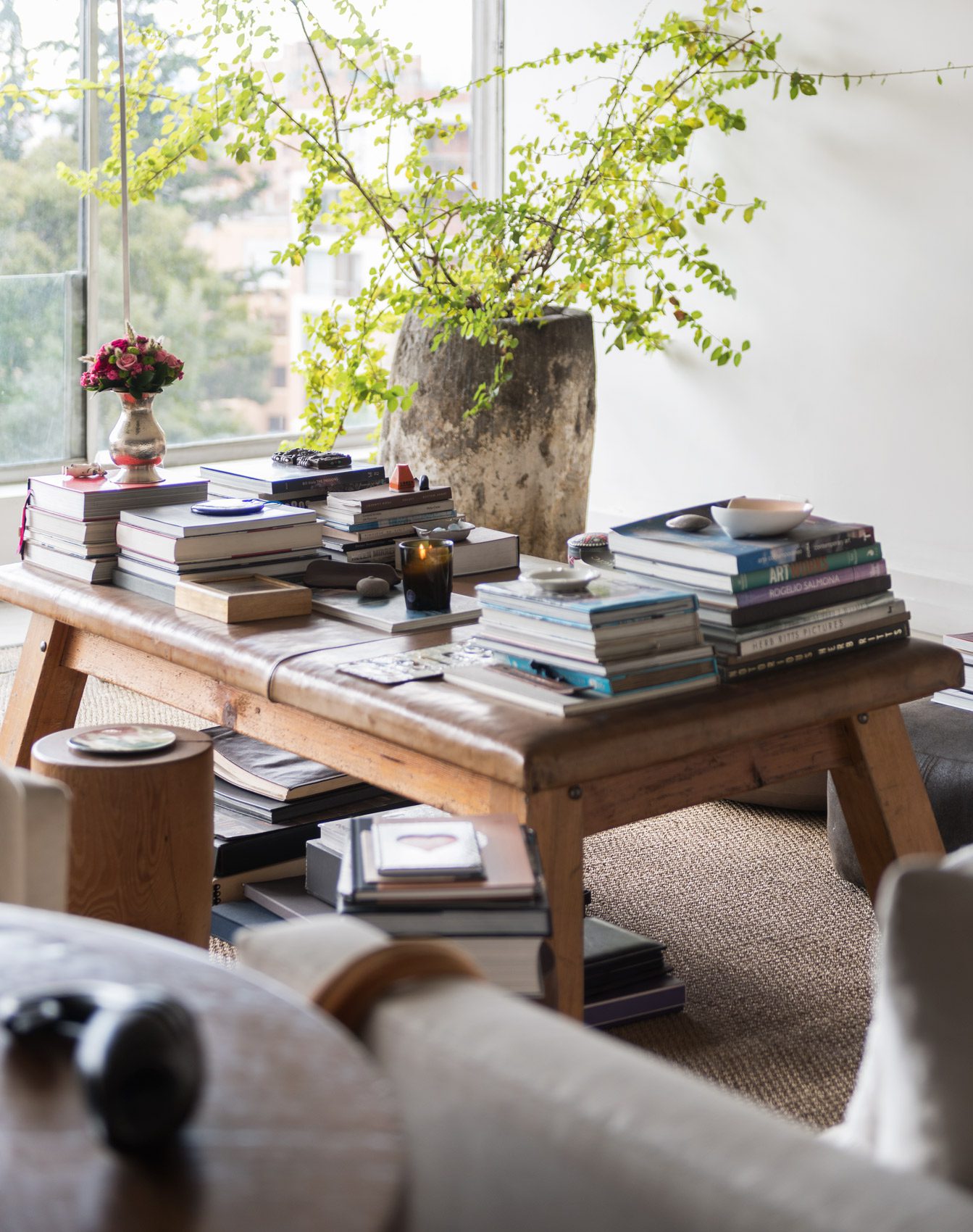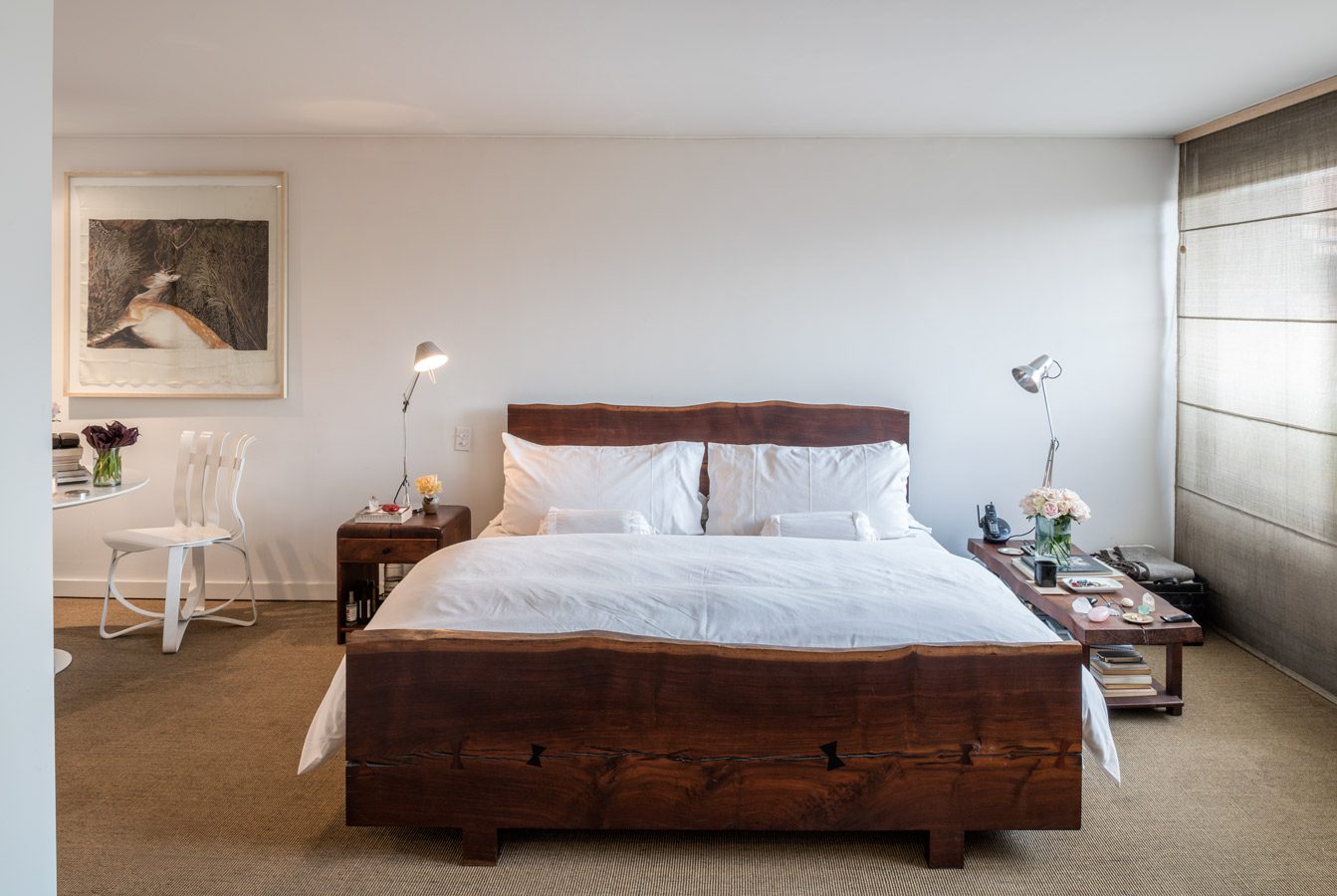 Los pufs y bancas –también de madera– de la sala, al igual que la cama de la habitación principal, son de la artista norteamericana Alma Allen. Su obra de formas orgánicas sugiere una afinidad con el paisaje del desierto estadounidense.