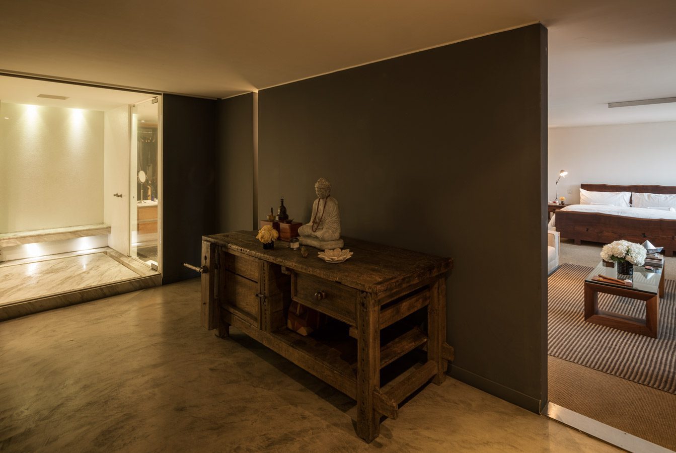 La mesa de apoyo sobre la cual se posa un Buda fue adquirida para un proyecto comercial del arquitecto paisa Pablo Uribe. Sin embargo, una vez llegó a este espacio, encontró su lugar y no volvió a salir de allí.