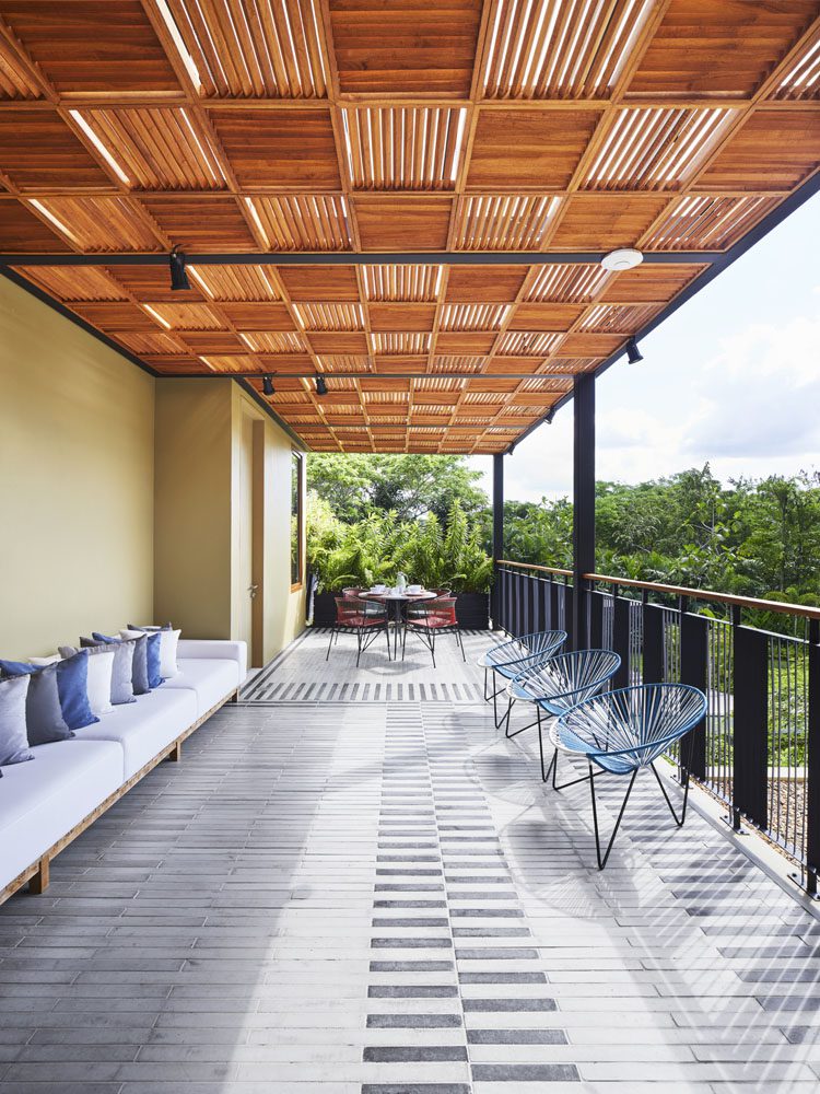 Así desarrollaron un sistema de cerramiento basado en un entramado de fibras textiles que funciona de manera similar a una celosía, al permitir que el aire circule al interior y la luz natural ilumine todos los rincones. “Estos elementos se derivan del concepto de tejido. A través de ellos buscamos, por decirlo de alguna manera, desnudar la estructura para encontrar aquello que el cliente aspira tener en su espacio personal”, comenta el arquitecto y fundador de la firma Hechizoo.