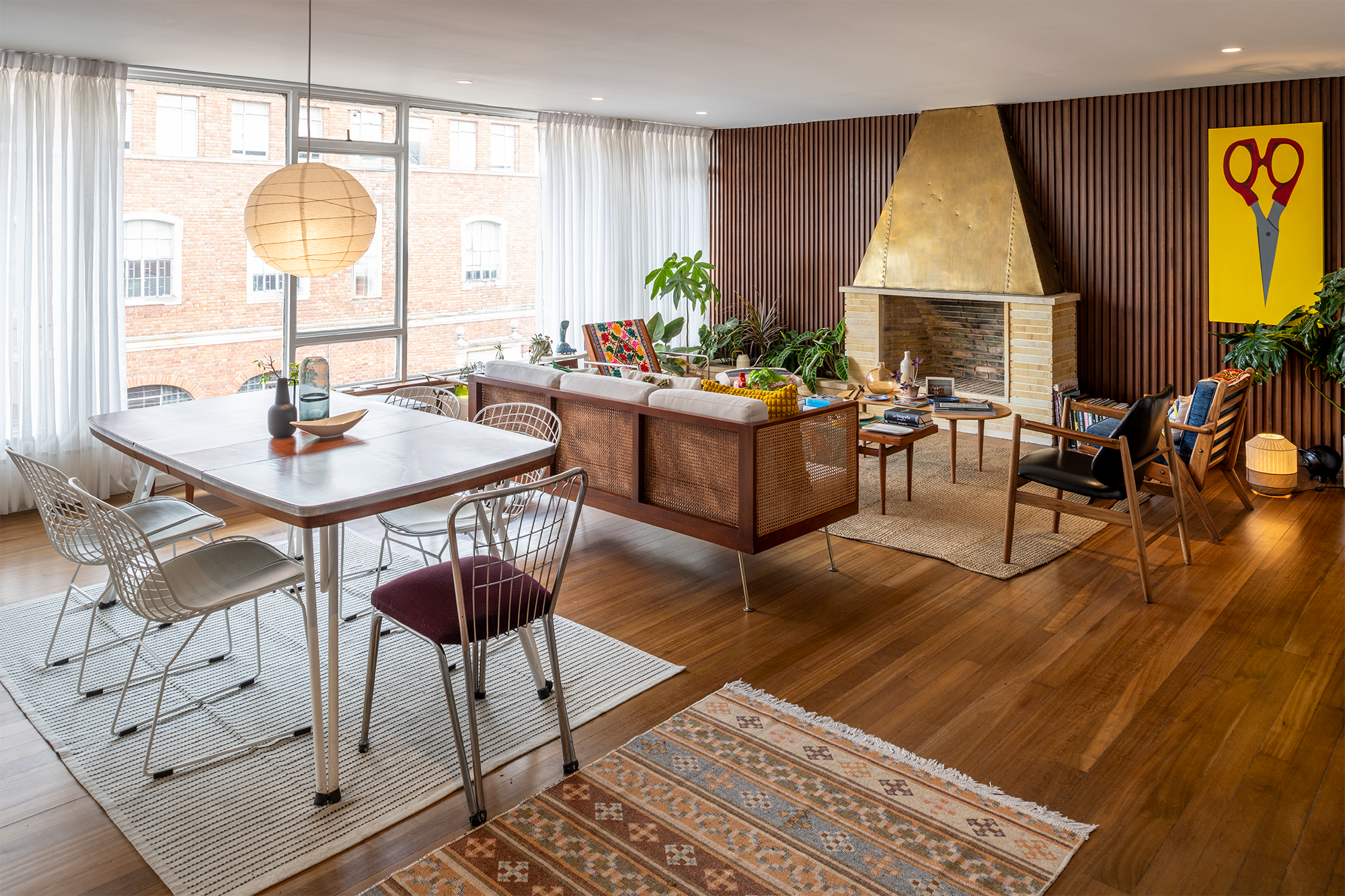 La renovación del apartamento respetó su esencia original, recuperando elementos como el piso de madera y el revestimiento de cobre de la chimenea, mientras se incorporan materiales artesanales como terrazo y carpintería metálica.