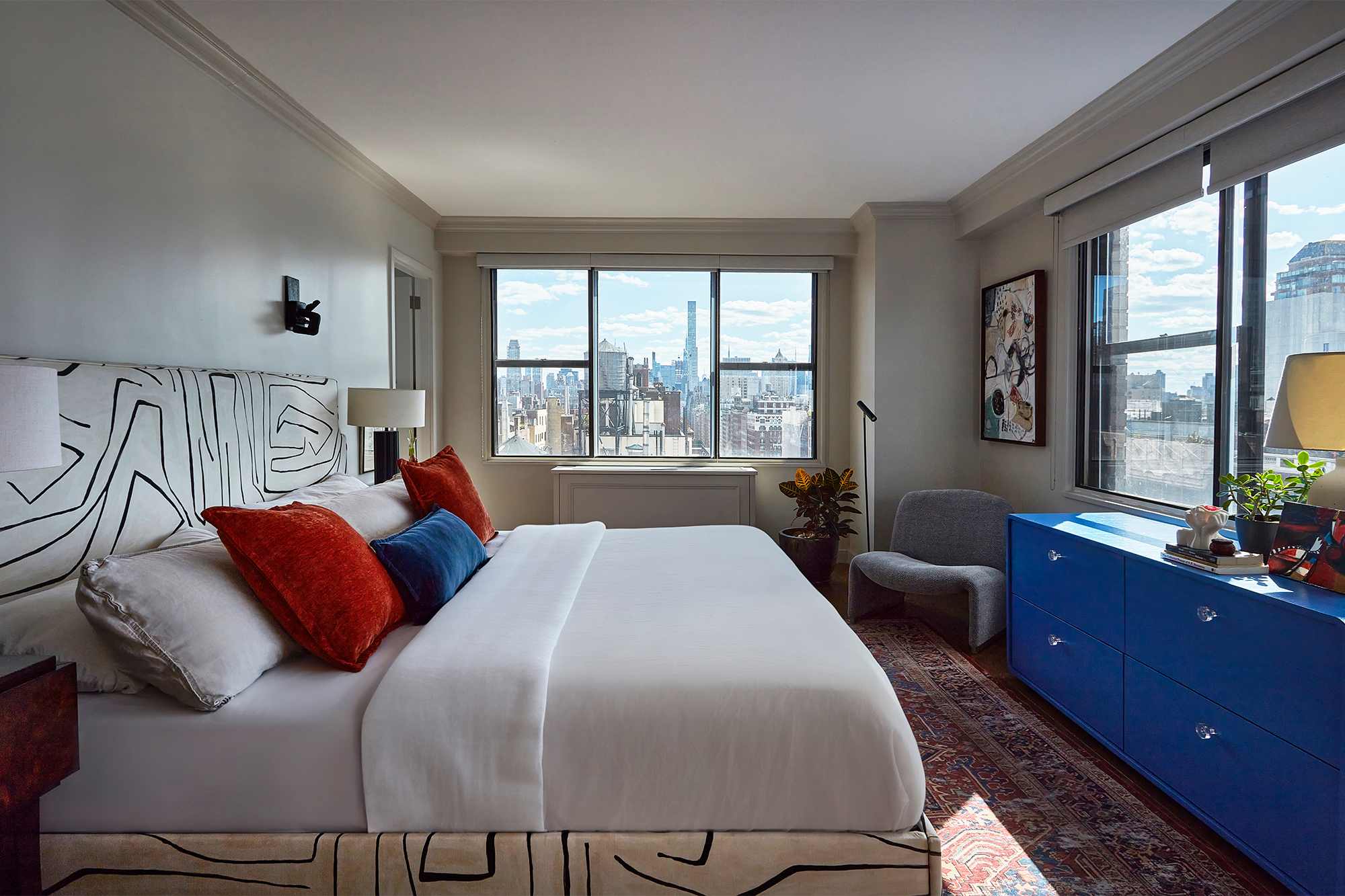 Desde el pequeño vestíbulo del apartamento, típico de las residencias neoyorquinas, ya se puede apreciar una primera muestra del diseño propuesto. Francisca mantuvo las baldosas terracota originales del piso, pero introdujo un papel de colgadura temático en el techo, como un guiño a la herencia persa de su propietaria. A partir de ahí, se renovaron tanto los pisos de madera como los baños, la carpintería y la cocina, para darle nueva vida al apartamento.