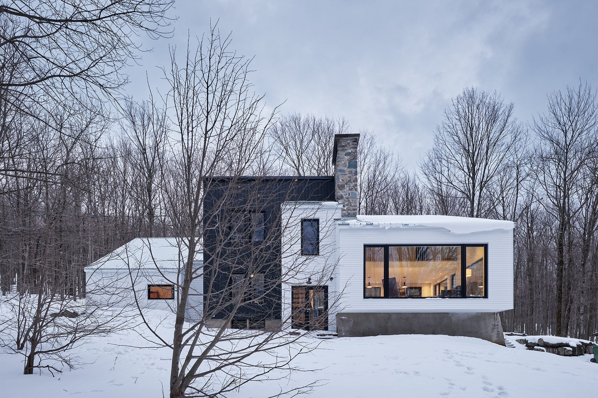 De este modo, la intervención consistió en una renovación completa del edificio de 370 m² distribuido en tres niveles, con los siguientes objetivos: que fuera una casa saludable, cómoda y funcional, que honrara la estructura existente, que infundiera un espíritu de «chalet de esquí contemporáneo» con un toque de originalidad y que maximizara las aberturas para traer la naturaleza a la casa.