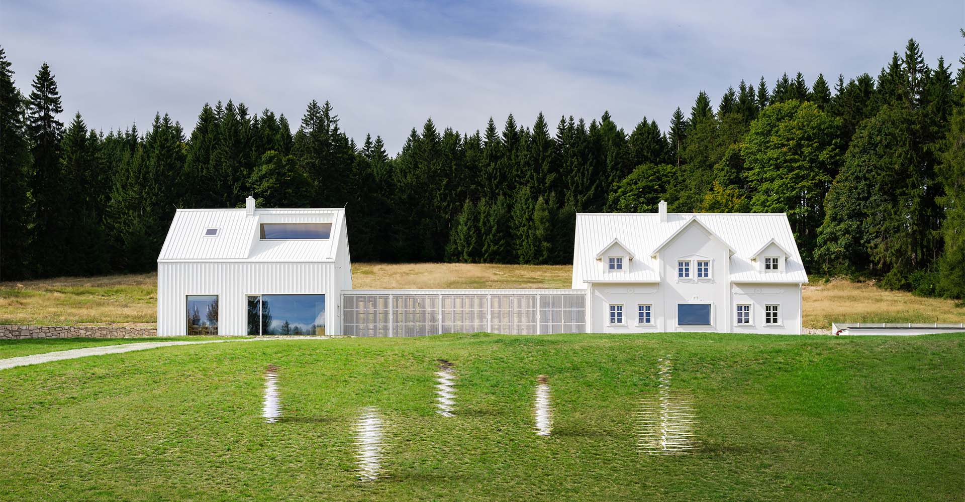 De este modo, se eligió el blanco para la nueva vida del complejo. Un blanco radical, incluso en la grava de los caminos de tierra. Se colocó una resistente cubierta de acero blanco sobre el edificio antiguo, que, a través del tejado de madera que conecta con la ladera, se transforma en una reluciente estructura de acero blanco sobre el nuevo edificio.