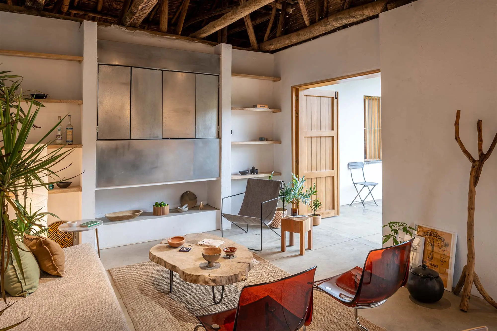Y a propósito de arte, la selección material en el interior se inspira en el arte povera o arte pobre, una corriente que se basa en el uso de materiales humildes o cotidianos, como tierra, piedras, hojas e incluso elementos reciclados.