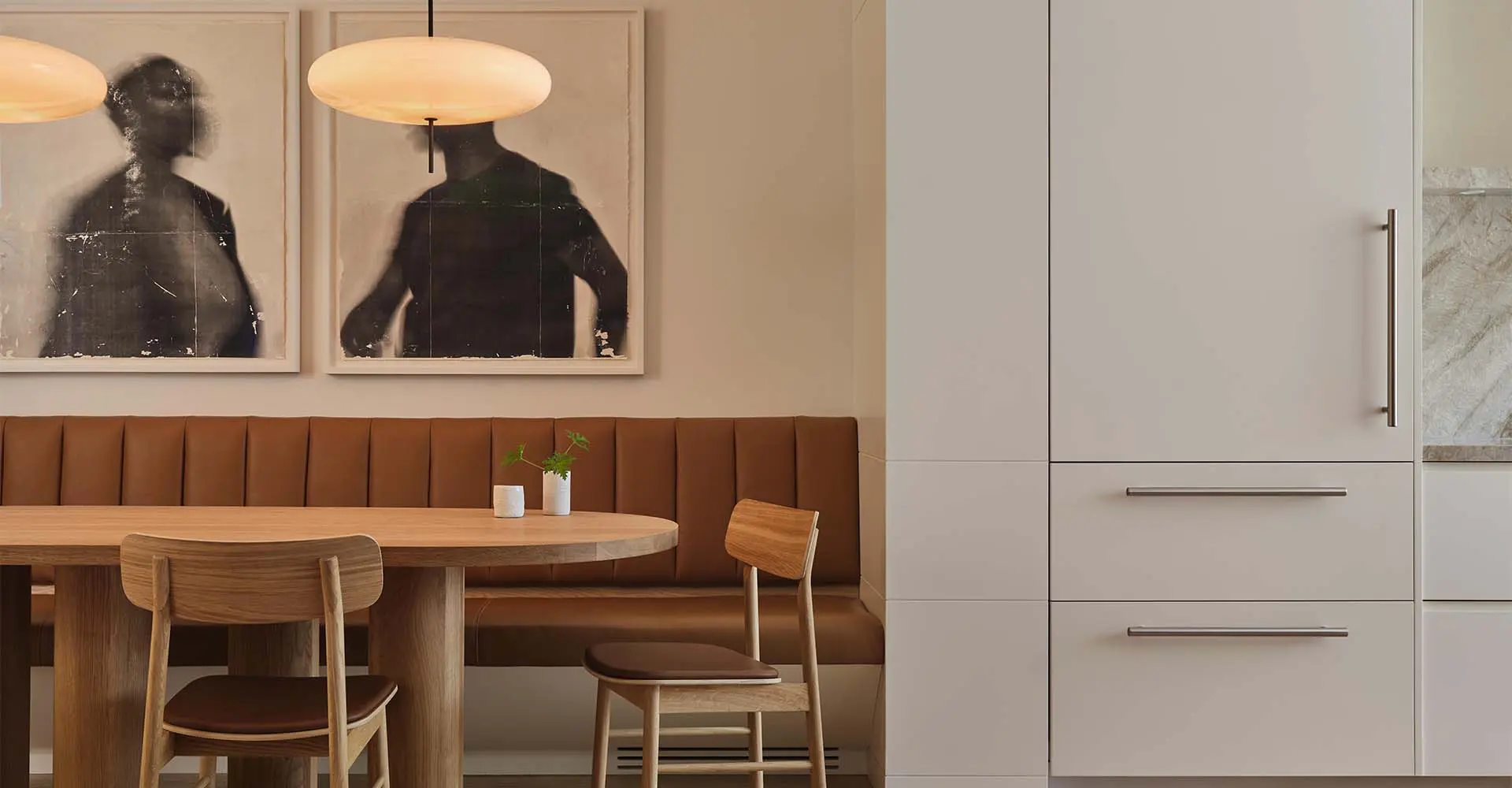 El comedor está diseñado para ofrecer intimidad y comodidad. Un banco empotrado facilita la circulación por la estancia a la vez que crea un ambiente íntimo para las comidas. Los bordes redondeados de la madera, la tapicería de cuero color caramelo y la iluminación escultural generan una sensación de calma táctil que se integra a la perfección con la vida cotidiana de la familia y las reuniones informales.