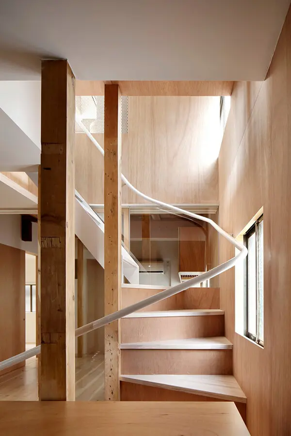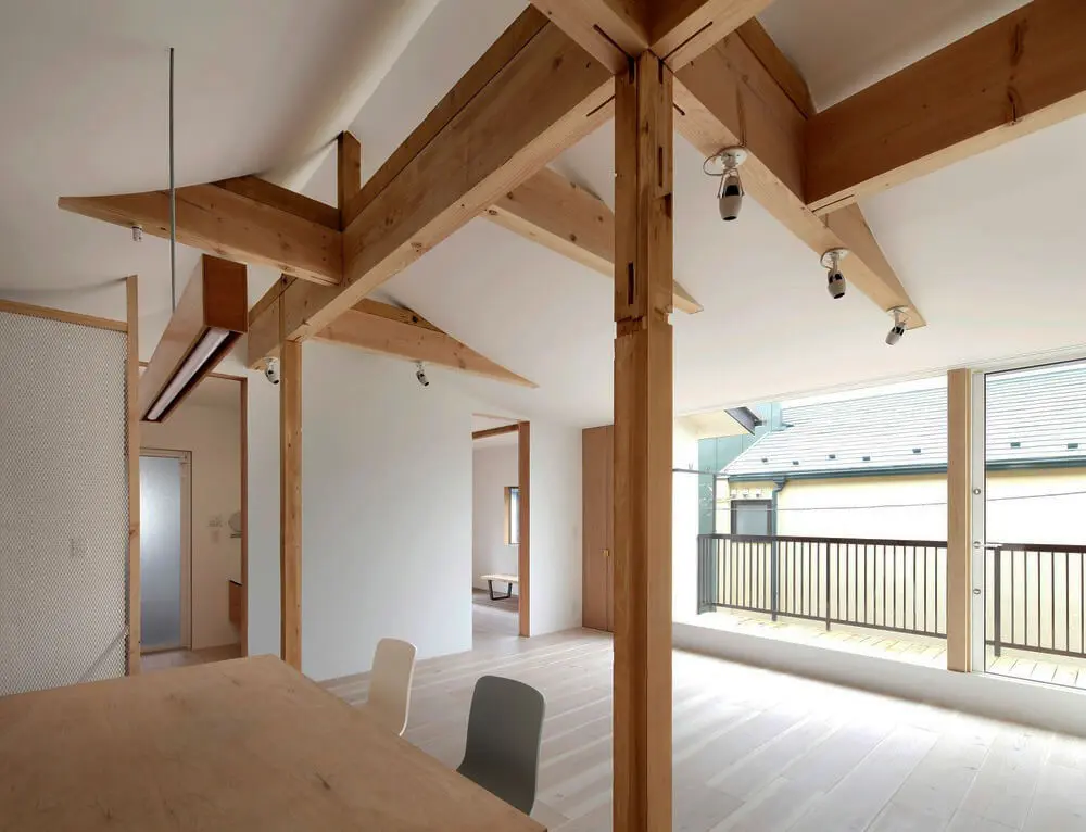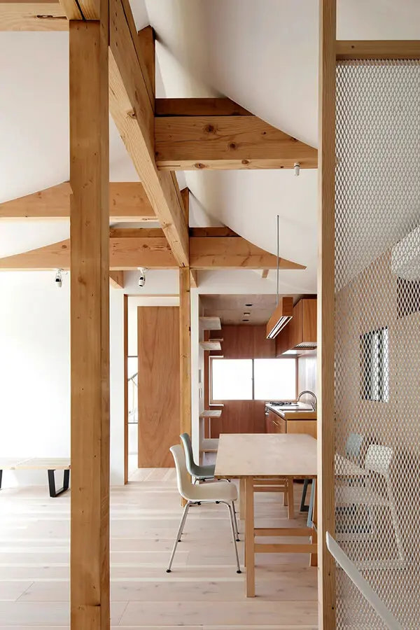 En primer lugar, los arquitectos de Tomomi Kito Architect & associates estudiaron cuidadosamente la disposición de las habitaciones para aprovechar al máximo las ventanas existentes, maximizando así la luz natural y la ventilación. Además, los espacios comunes adyacentes a las habitaciones privadas se aseguraron en cada piso. Estos espacios, actúan como centros de comunicación para conectar sin problemas diferentes generaciones. Las salas privadas también son intercambiables entre los miembros para mejorar la comunicación entre generaciones; similar a un estilo de vida compartido. Sin embargo, dado que las habitaciones privadas se priorizaron en la planificación, asegurar suficiente luz natural en el espacio común en el primer piso se convirtió en otro desafío; particularmente cuando mira al norte. En consecuencia, se diseñó un techo de catenaria en el segundo piso para reflejar mejor la luz del día en el primer piso; esto se convirtió en una característica distintiva de la casa. Al mismo tiempo, se renovó la estructura existente.
