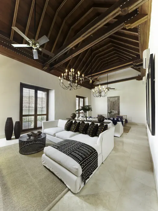 La razón viene de la época en la que se concibió la casa: la Colonia, pues sus constructores fueron carpinteros navales, que sabían de hacer barcos y quillas y no de diseñar techos. Por eso, tiene ese aspecto particular que actualmente es realzado mediante lámparas tipo candelabros de estilo belga, del siglo XIX, de la compañía Restoration Hardware.