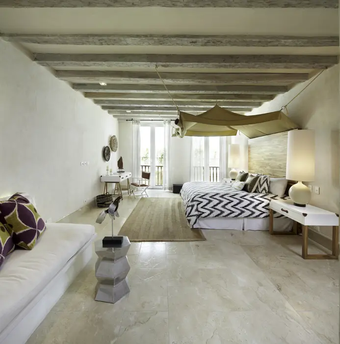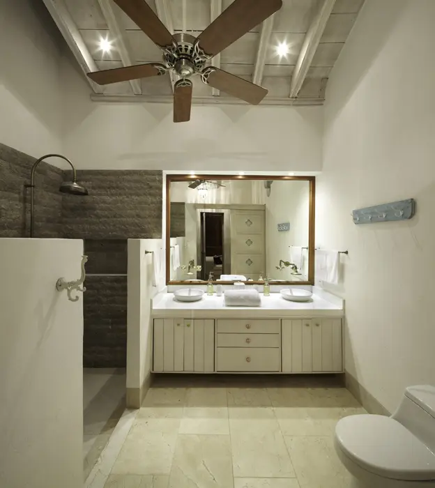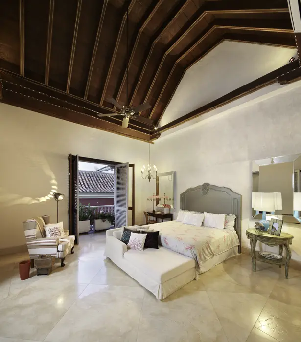 La cama posee un espaldar de madera con un labrado provenzal de rosas; un candelabro, del mismo estilo, cuelga del techo. También hay un sofá de apoyo y una poltrona club chair de lona. Para no desentonar, el baño de la alcoba cuenta con dos duchas, mesón de roble blanco y grifería de cobre en sus dos lavamanos.