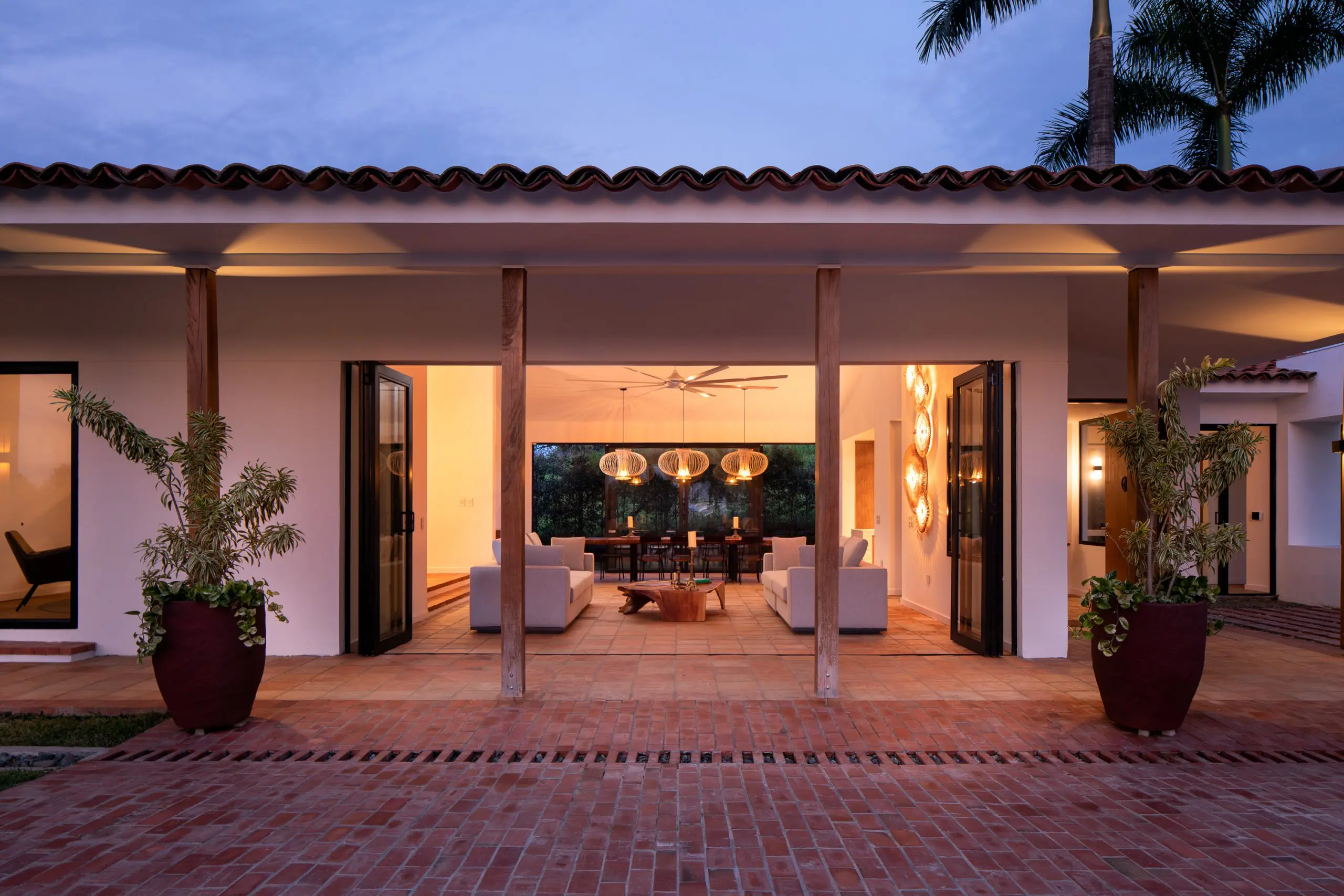 Una de las estrategias de Restrepo radicó en alargar ambos extremos de la planta rectangular de la casa existente para contener las estancias en un solo nivel y que cada una de estas tenga una relación directa con el entorno, mediante ventanas controladas en las habitaciones y ventanales de piso a techo en los ambientes sociales. Otra fue extender la cubierta para resguardar las partes nuevas, pero también para crear un alero generoso que protege del sol al interior y que, al mismo tiempo, define un corredor exterior delimitado por columnas de madera, que se orienta hacia la piscina.