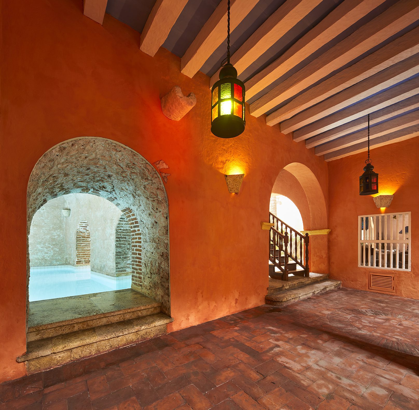 Por otra parte, cabe señalar una variación en el planteamiento anterior que, en términos prácticos, supone un cambio transcendental: uno de los patios interiores se convirtió en una piscina a cielo abierto, donde es posible disfrutar del sol y la brisa caribeños. En cuanto al mobiliario, destaca el hecho de que uno de los propietarios sea de origen suizo, por lo que la esencia europea se manifiesta tanto en los muebles como en los objetos decorativos. El barroco italiano junto a la mezcla de colores intensos crean una atmósfera poética en la que el juego de luces y sombras se realza.