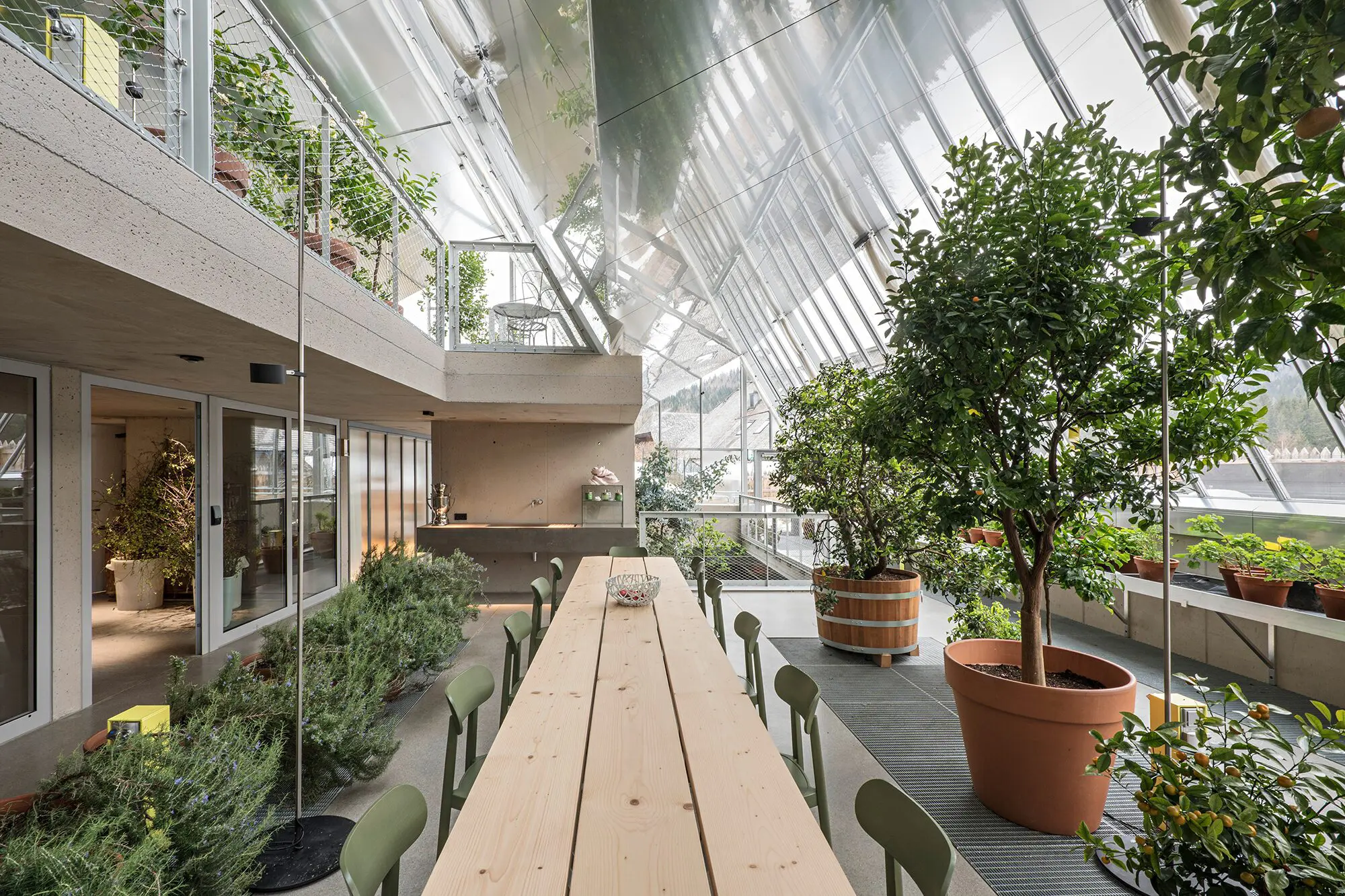 En la gran casa de cristal, un híbrido de moderno invernadero y espacio habitable que se fertilizan mutuamente, hay camas integradas para dormir, así como una zona de bienestar con sauna y chimenea.