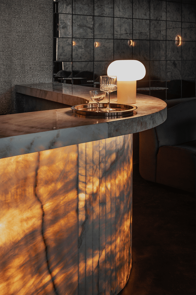 Para este bar, utilizaron siete toneladas de piedra natural. Por ejemplo, en el espacio central de 1920 predomina el Onyx, mármol que la arquitecta eligió por ser traslúcido y por permitir el manejo de la iluminación a través de este material. Esto le da “fuerza a la barra principal, un ambiente relevante para la propuesta por su carta de cocteles”, explica.