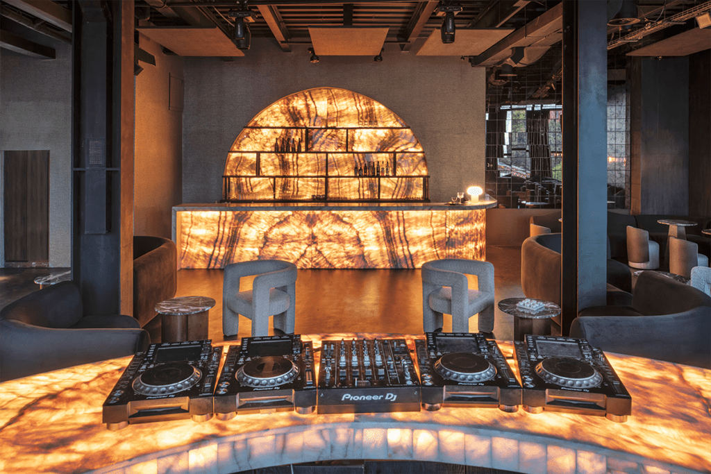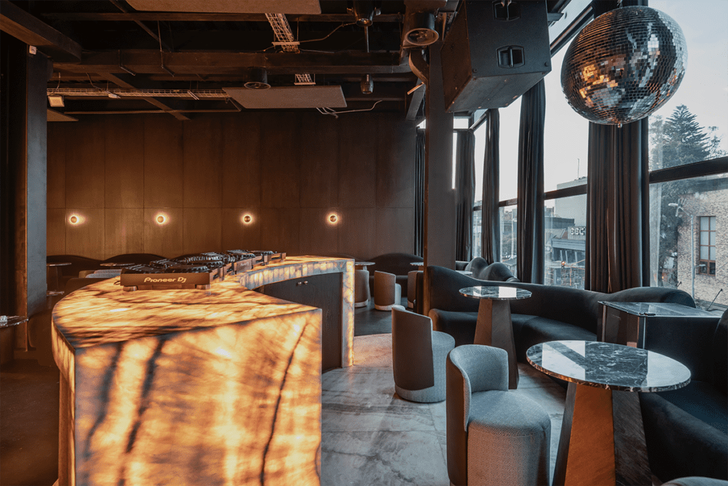 En el otro extremo se encuentra una medialuna que enmarca el VIP, compuesto por un piso en Onyx miel mate, instalado para dar un acabado diferente al área, sin dejar de lado su relación con el resto de las zonas. En este espacio está la barra del DJ, que reproduce las formas, materiales y manejo de la luz del bar central.