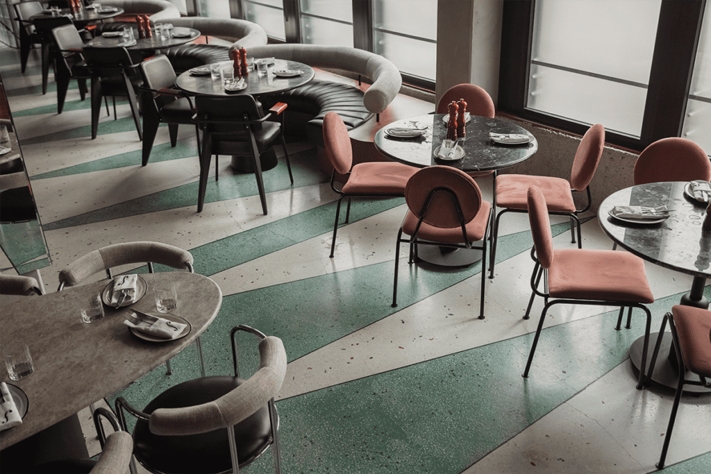 Dado que el restaurante se encuentra en un edificio cuya estructura es metálica, las referencias parisinas se conjugan con elementos de carácter industrial. Este mestizaje estético se traduce en un espacio pleno de contrastes, en el que los materiales de origen natural y de aspecto artesanal, como la madera utilizada en el parquet del piso y la carpintería arquitectónica, se combinan con otros de apariencia fabril, como el enchape tono vino tinto que reviste algunos muros.