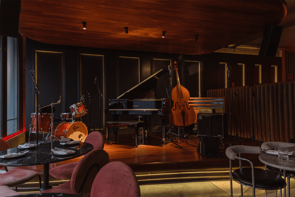 Este proyecto consiste en la remodelación interna de uno de los locales del primer piso, con el fin de alojar un bar dedicado a presentaciones musicales, especialmente de jazz. El sentimiento de nostalgia por una época dorada de este género musical se reinterpreta en la imagen íntima y serena que transmite el lugar.