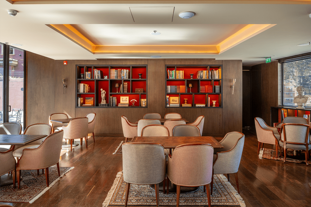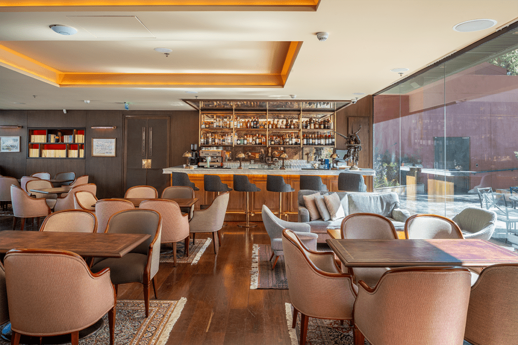 En el bar se destaca el uso de grandes ventanales que inundan el interior de luz natural, acentuando los contrastes entre los acabados contemporáneos y los elementos clásicos. La iluminación también resalta la casa original como el corazón del espacio, simbolizando el legado del club. Los materiales elegidos, como la madera panelada y las bibliotecas con fondo rojo, evocan la solidez y la elegancia que caracterizan al Jockey Club, y refuerzan su identidad.