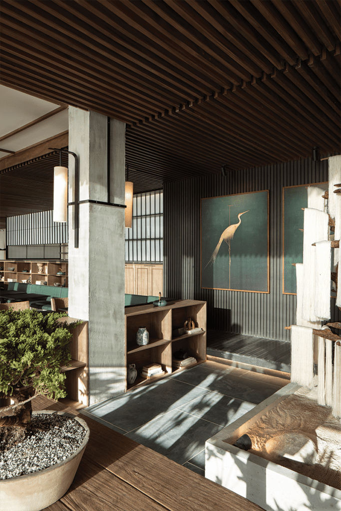 La narrativa visual de Shio se construye por medio de su materialidad y sus formas. Los elementos de diseño, como la madera, la piedra, el concreto y el acero crudo, se combinan para crear un ambiente sereno y acogedor.