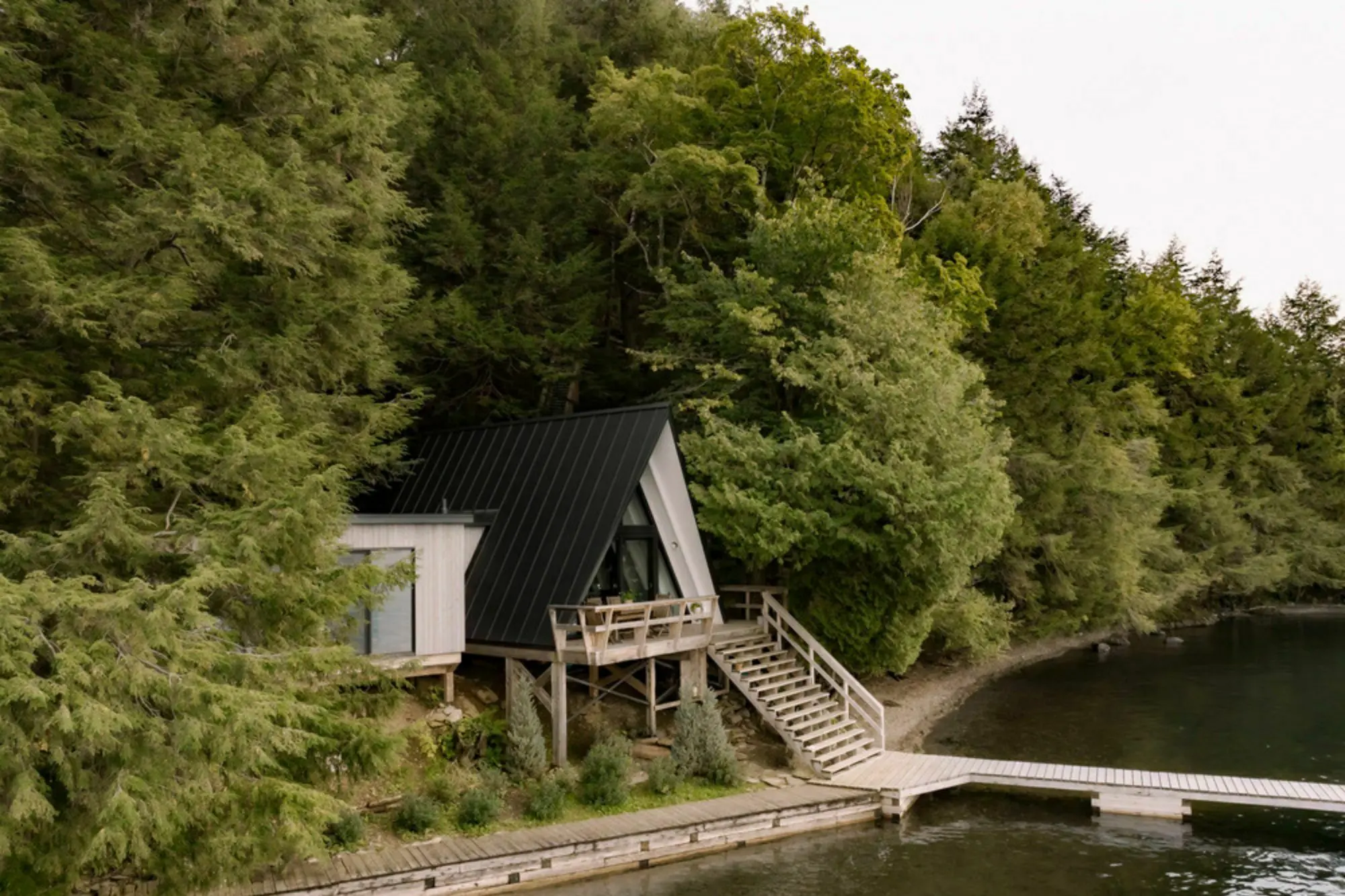 La cabaña integra múltiples espacios habitables dentro de su huella relativamente pequeña. La gran ventana principal con marco en A se desplazó hacia el interior para acomodar un área de comedor exterior más grande. Esta, seguida en el interior por la sala de estar y el rincón del comedor, que ofrecen vistas espectaculares del lago a través de las ventanas grandes.