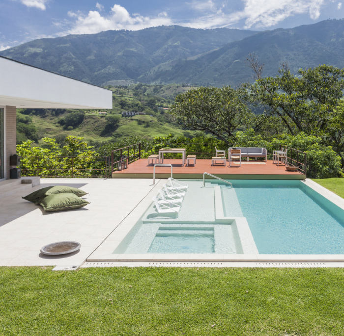 Los volúmenes están dispuestos sobre los bordes de las pendientes que definen la meseta en la que se encuentran el patio interior y el área de la piscina, así liberan la estructura y, de esta forma, las terrazas de alcobas y corredores de zonas comunes quedan en relación directa con el paisaje para lograr el máximo aprovechamiento de la vista; de igual manera, rescatan la mayor porción de lote plano para el disfrute de la casa.