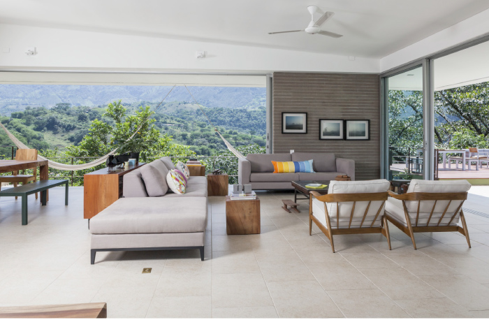 Al final, la vivienda se implantó en el declive. Gracias a esto, liberaron la parte plana para tener una zona verde alrededor de la estructura y, de igual forma, vincular todos los espacios con el impresionante paisaje circundante. Para cumplir con los requerimientos y lograr el programa de esta casa, que incluye salón, comedor, cocina, áreas de servicio y cuatro habitaciones, “fue fundamental la separación de los usos colectivos y privados, dispuestos en dos volúmenes independientes y articulados a partir de un patio; así, el espacio vacío es el elemento organizador.
