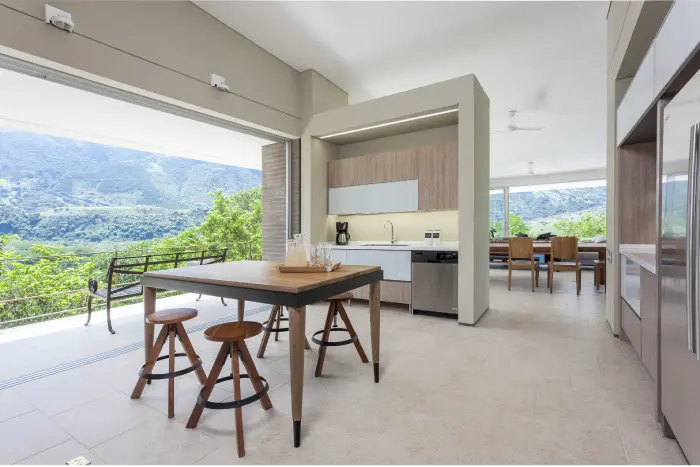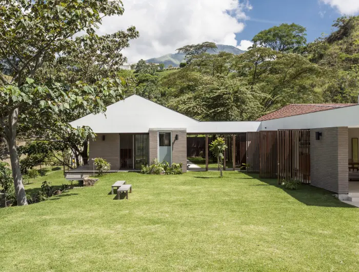 Al final, la vivienda se implantó en el declive. Gracias a esto, liberaron la parte plana para tener una zona verde alrededor de la estructura y, de igual forma, vincular todos los espacios con el impresionante paisaje circundante. Para cumplir con los requerimientos y lograr el programa de esta casa, que incluye salón, comedor, cocina, áreas de servicio y cuatro habitaciones, “fue fundamental la separación de los usos colectivos y privados, dispuestos en dos volúmenes independientes y articulados a partir de un patio; así, el espacio vacío es el elemento organizador.