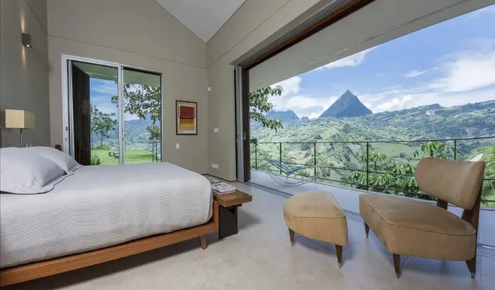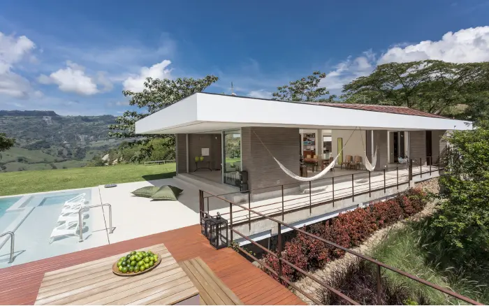 Los volúmenes están dispuestos sobre los bordes de las pendientes que definen la meseta en la que se encuentran el patio interior y el área de la piscina, así liberan la estructura y, de esta forma, las terrazas de alcobas y corredores de zonas comunes quedan en relación directa con el paisaje para lograr el máximo aprovechamiento de la vista; de igual manera, rescatan la mayor porción de lote plano para el disfrute de la casa.