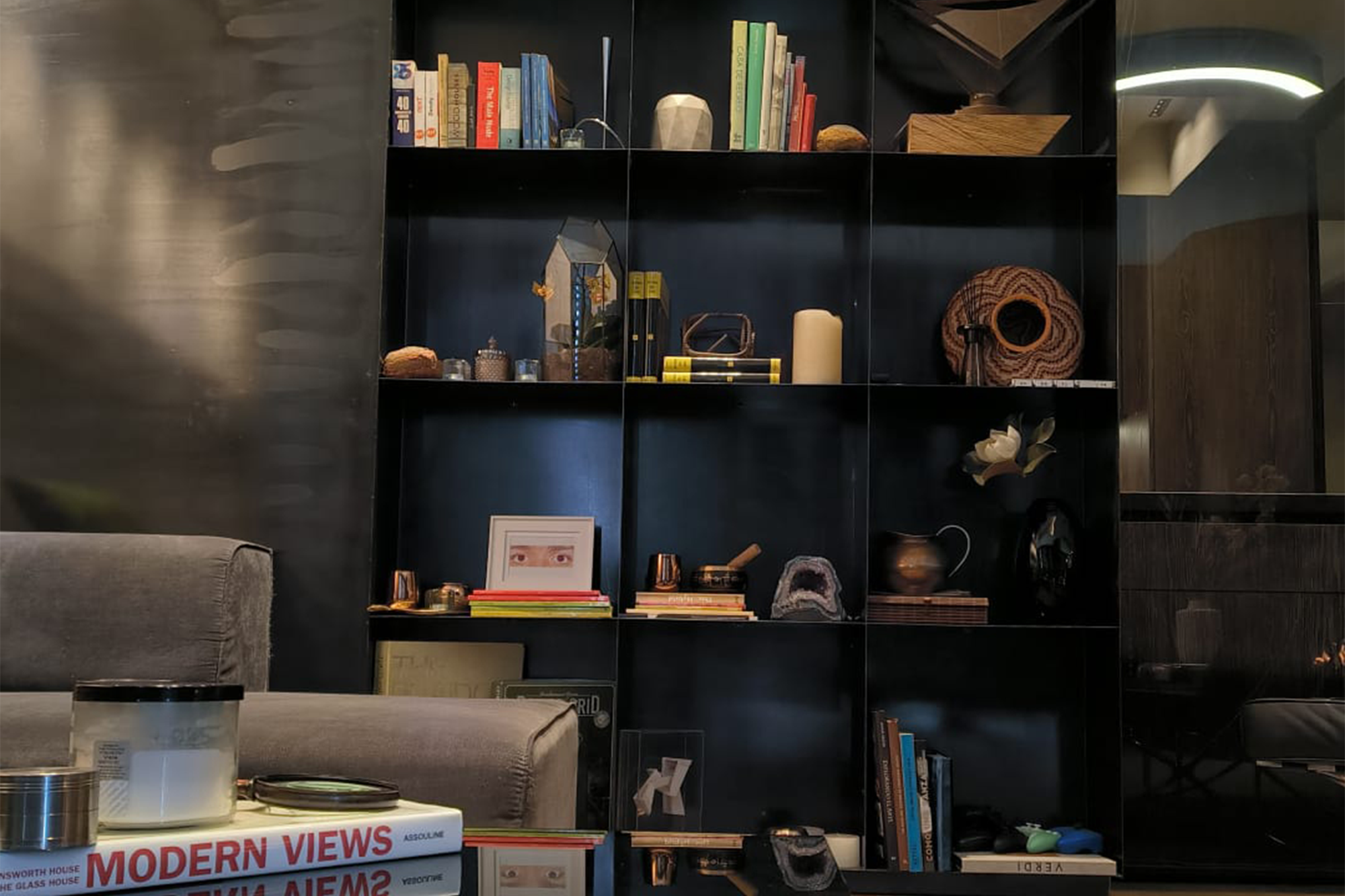 Uno de los focos del diseño es la sala principal. Aquí, una biblioteca se erige como un testigo de memorias y vivencias, donde los objetos, lejos de ser decorativos, funcionan como un repositorio de experiencias compartidas: recuerdos de viajes, libros y obsequios únicos que crean una conexión emocional que inunda el ambiente de historias.