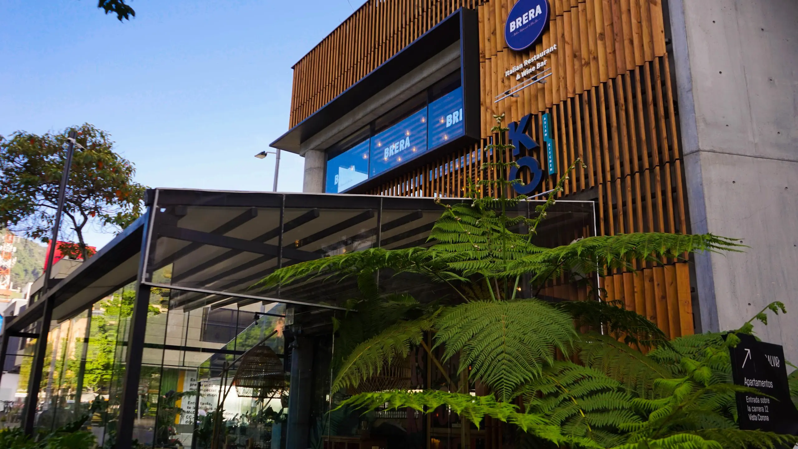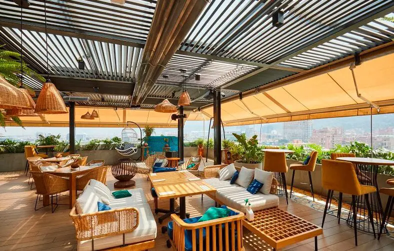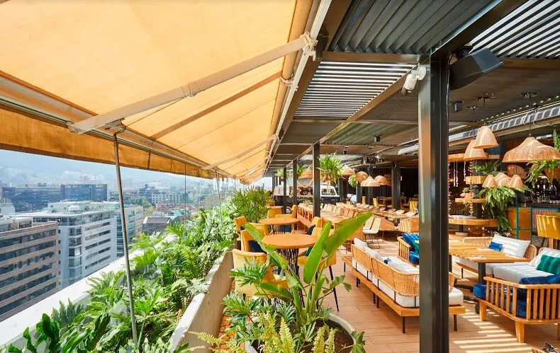 Los restaurantes del primer piso se extienden hacia el área pública a través de sus generosas terrazas. Cubiertas con pérgolas -elaboradas por talento colombiano en la ciudad de Cali y proveídas por Parasoles Tropicales-, se convierten en espacios para ver y ser vistos. Las pérgolas, retráctiles, bioclimáticas y equipadas con una tecnología única en Latinoamérica, permiten garantizar una continua ocupación de la zona al resistir las inclemencias del sol, el viento, la lluvia y el granizo bogotanos, retrayéndose con solo presionar un botón para disfrutar completamente del exterior. De esta manera el edificio activa permanentemente la vida urbana y se relaciona íntimamente con la ciudad.
