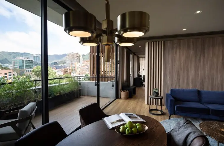 El interiorismo fue desarrollado por Marcela Villegas, y el mobiliario proviene en su mayoría de Habitat Store. Los electrodomésticos que acompañan la vida en todos estos espacios, proveídos por la compañía Challenger, siguen esta línea de diseño elegante y sobria, caracterizada por la amplia presencia de la madera y la naturaleza.