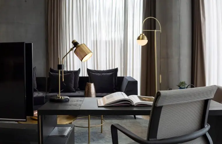 del edificio, pero se complementan con piezas de mobiliario de corte clásico y acabados elegantes y sobrios, como el terciopelo o el cuero.