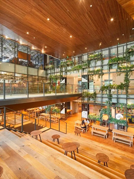 “El edificio es una invitación”, comenta Arias, y el resultado construido lo confirma. Es una invitación a recorrerlo, utilizarlo, tocarlo…, a vivirlo. Sus primeros tres niveles son de uso comercial y se abren por completo hacia el parque por medio de una fachada transparente. Al acceder nos recibe un atrio de triple altura, que alberga una amplia escalinata a través de la cual se integra el área activa con el primer sótano y lo hace habitable. La escalera es, a la vez, una gradería, un espacio para recorrer, pero también para estar, sentarse a comer y tener una agradable conversación.