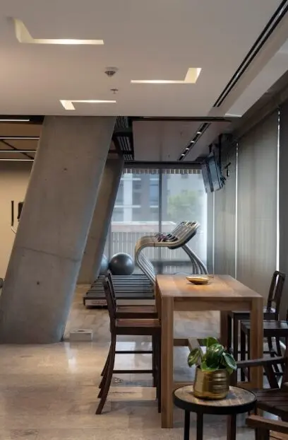 Sobre el área comercial, en el tercer piso, el diseño plantea un centro de negocios cuyos salones de reuniones y zonas de servicio se ofrecen como espacios complementarios a los apartamentos de corta estancia que se ubican encima. Su