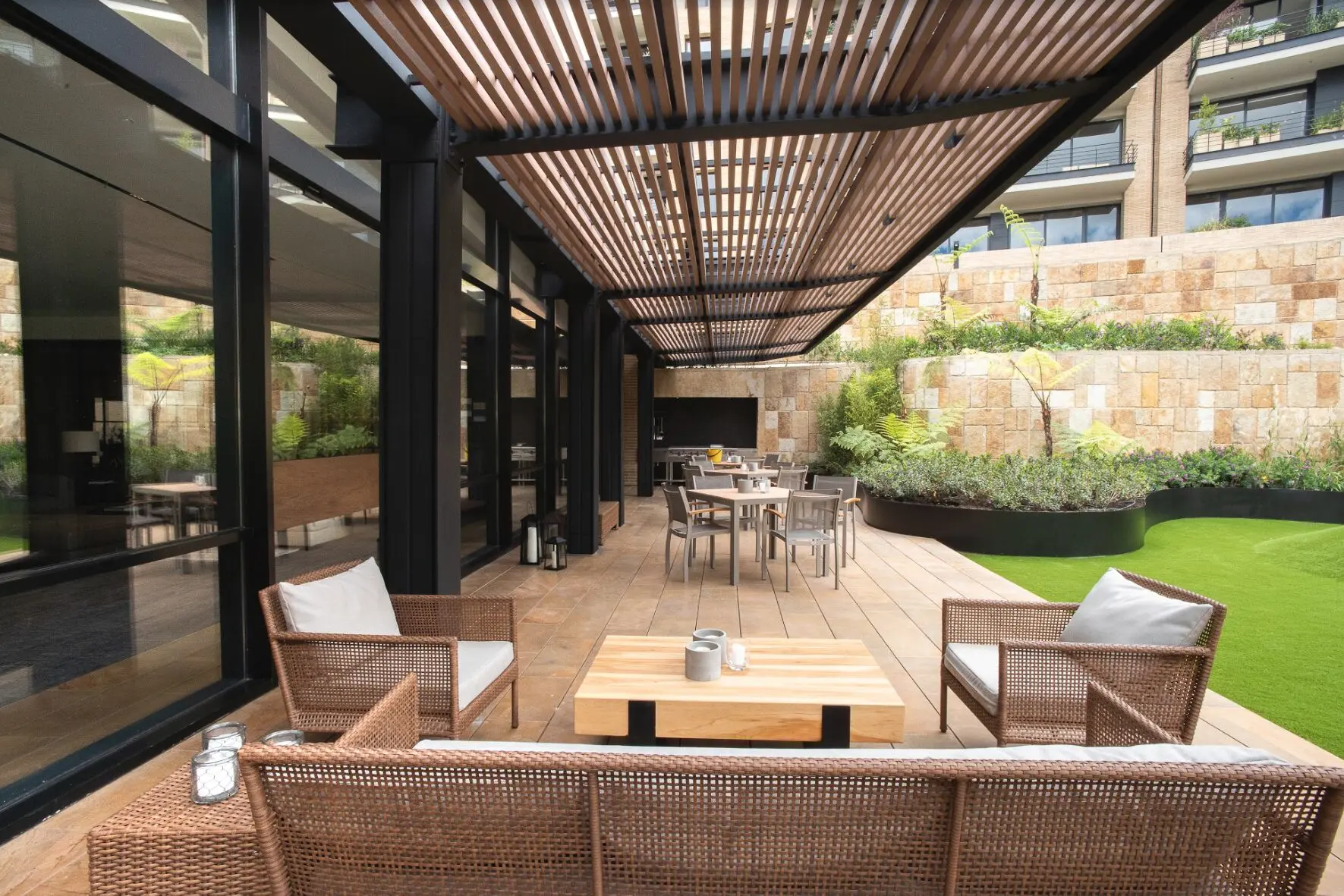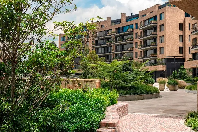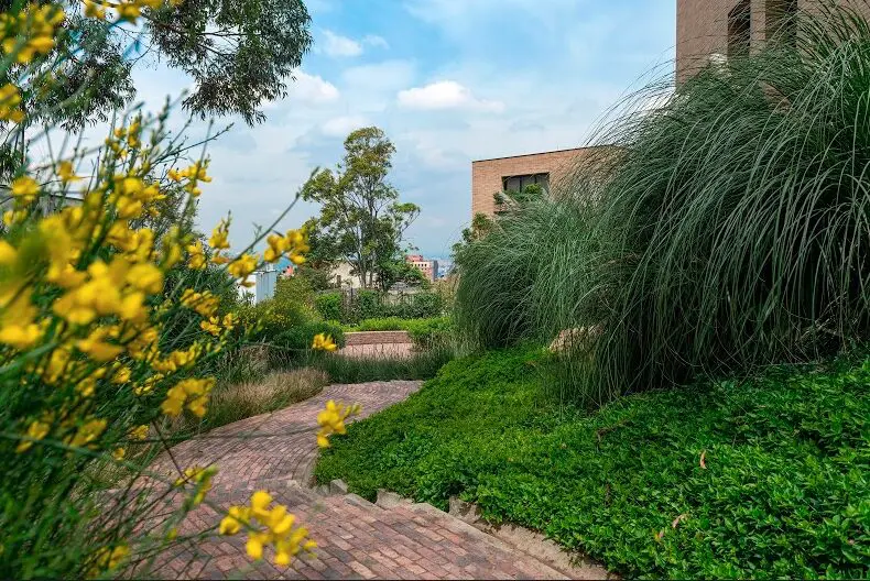Disfruta de una inmejorable vista sobre el tejido urbano hacia el occidente; hacia el oriente, su límite es una reserva forestal que irrumpe con fuerza entre los edificios construidos y se convierte en protagonista de todos los espacios. Este es un tsunami verde, como lo denominan sus diseñadores, en el que sembraron 36.520 plantas, muchas de las cuales producen flores y atraen fauna. Su presencia llena aún más de vida los ambientes comunes que ofrece el proyecto a sus habitantes y los conecta con la naturaleza, les da posibilidades de interacción en época de distanciamiento y encuentra, tal vez, la respuesta a esa pregunta que nos hacemos todos: ¿cómo será esa nueva normalidad?
