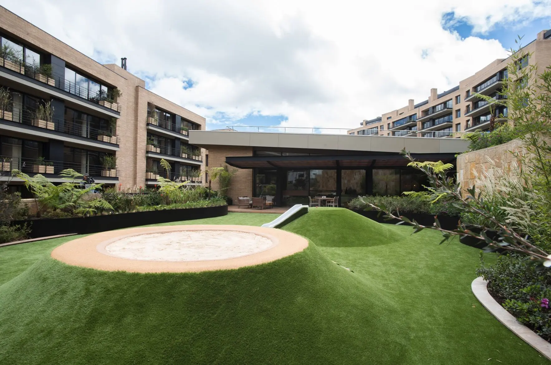 El diseño busca retornar a una versión contemporánea de la tradicional vida de barrio, donde los niños juegan tranquilamente afuera con sus amigos, donde hay lugar para las bicicletas y para las mascotas, y donde es posible entrar en constante interacción con el verde de la naturaleza sin peligro alguno. Con lo anterior en mente, los diseñadores proyectaron un conjunto que ofrece 1,6 kilómetros de senderos peatonales, una sucesión de terrazas y plazoletas que generan distintas posibilidades de interacción y encuentro, un parque para perros donde quienes tienen sus mascotas las disfrutan de manera independiente, y en el corazón de la obra, un Club-House cuya cubierta funge también como una amplia explanada verde para que los niños y sus familias la usen a su mejor parecer. Toda una red de espacios exteriores, abiertos y diversos, que permite el encuentro en un entorno seguro, al aire libre, ventilado y propicio para mantener el célebre distanciamiento social.