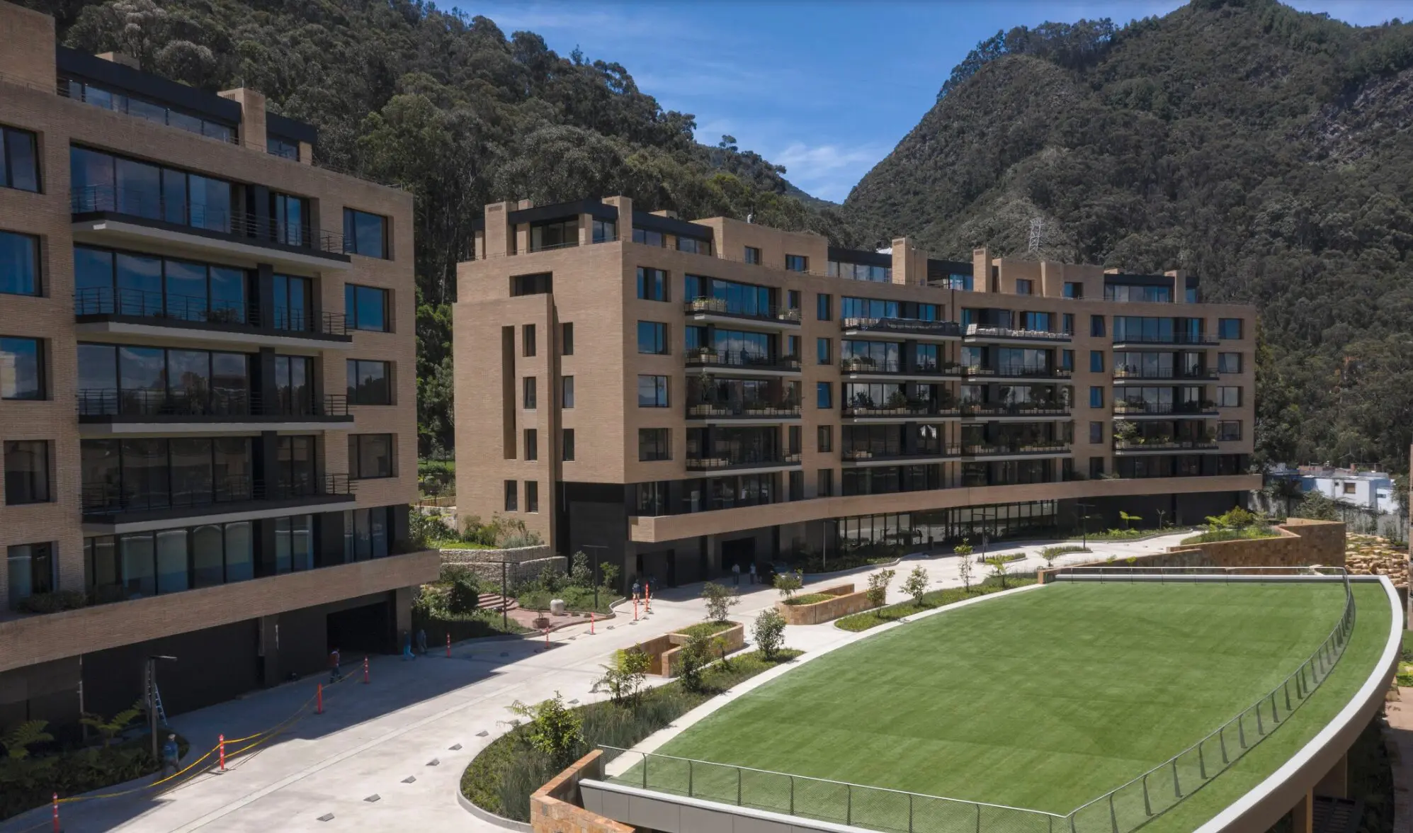 En el momento en que los arquitectos bogotanos Héctor Uribe y Juan Rodríguez, socios de la empresa Escalar, concebían Santa María de los Cerros, nadie se imaginaba una situación medianamente parecida a la que estamos atravesando. El mundo era otro. No obstante, el diseño construido parece responder a muchas de las condicionantes que nos trae esta nueva normalidad. “Comercialmente, al proyecto le ha ido mejor durante la pandemia”, comenta Uribe, tal vez porque las cualidades de su programa original responden a lo que sus clientes quisieran tener para afrontar este escenario atípico. La idea original giró siempre en torno a sus áreas comunes, con el objetivo de ofrecer la posibilidad a sus habitantes de “disfrutar de los espacios exteriores de manera segura”.