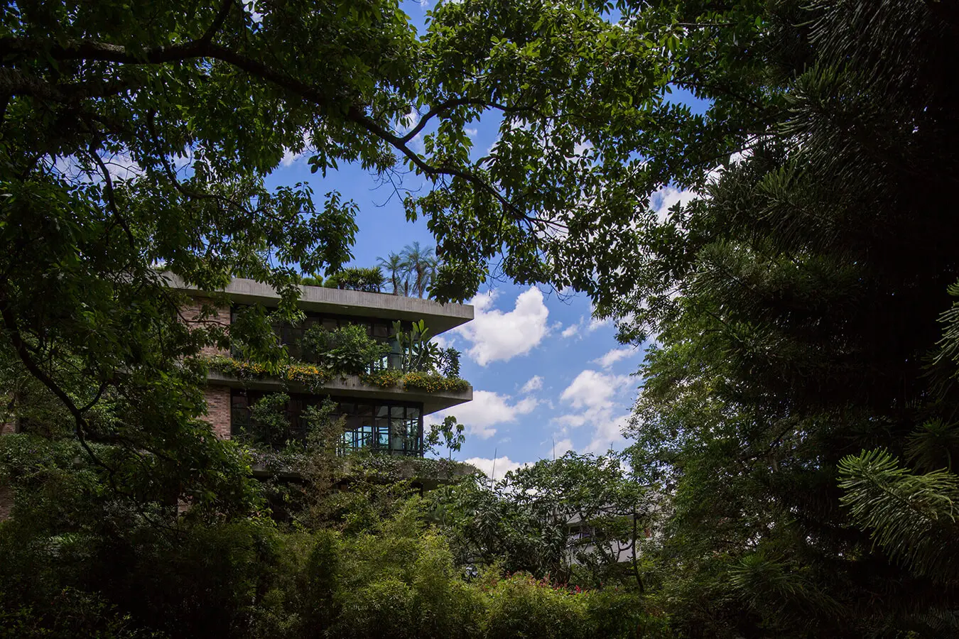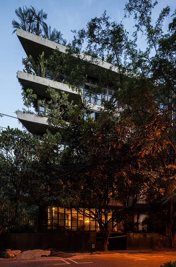 Visto desde afuera, resalta por el verde que se intercala entre los muros de ladrillo, las placas de concreto a la vista, las celosías de madera rústica y los elementos metálicos. En el interior, los diferentes componentes establecen relaciones directas con los habitantes del proyecto por medio de celosías abiertas hacia el exterior y ventanales piso-techo; tanto los apartamentos como las circulaciones comunes se vinculan al contexto urbano y la vegetación contenida en el edificio.Santiago, juan francisco y camilo arango