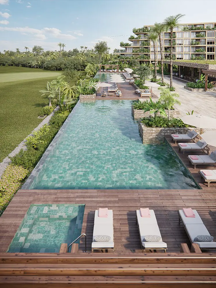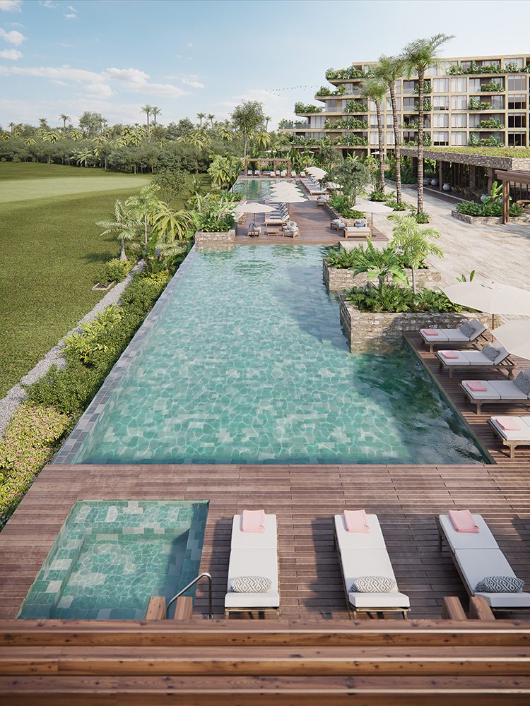 Esta propuesta liderada por Arquitectos ALH + 5 Sólidos, nace de la inspiración de crear un espacio lleno de experiencias para disfrutar una vida de lujo y tranquilidad, con amenidades tipo club que incluyen Restaurante & Bar, dos piscinas infinitas y una cubierta, dancing terrace, cancha de tenis, sala de cine, salón de coworking, sala de juntas, gimnasio y spa, además de contar con una vista espectacular a los espacios naturales de Serena del Mar, como el lago o el campo de Golf, ofreciendo tranquilidad y confort.