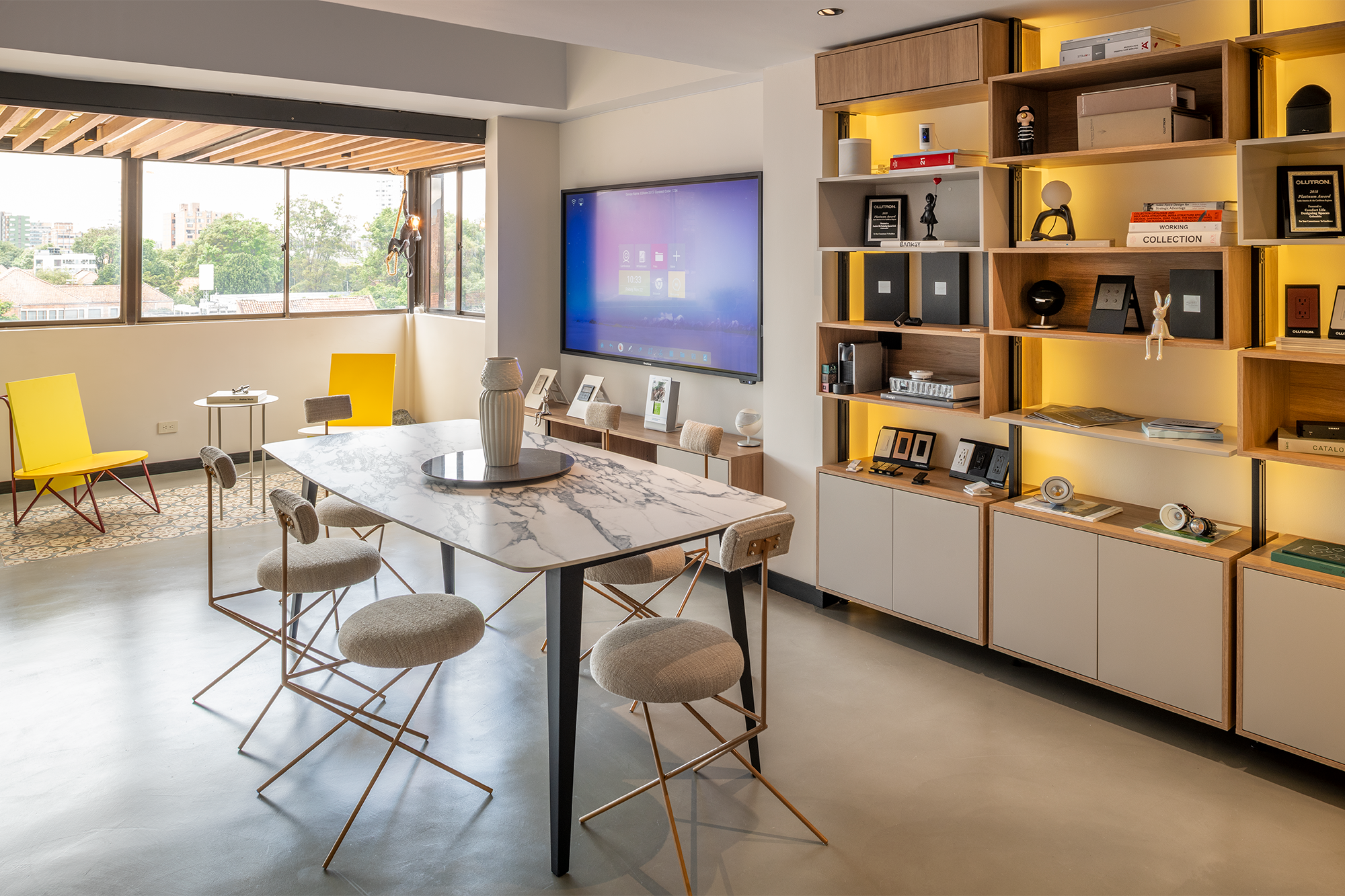 La segunda consiste en disponer un área de reunión para planear colectivamente los proyectos, no solo visualizando los productos, sino interactuando con ellos. “Instalamos una pantalla interactiva de 86 pulgadas en la que se proyectan los planos y las imágenes 3D, que sirven como insumo para la conceptualización de los proyectos”. Así, este showroom es un ambiente expositivo y, al mismo tiempo, vivencial.