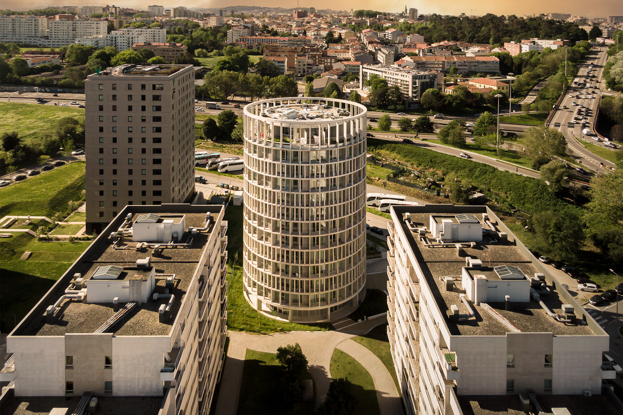 Integrado entre volúmenes ortogonales, esta torre rellena un vacío urbano creado por las distintas discontinuidades asociadas a la autopista de circunvalación interior. En esta obra, diseñada por la firma OODA, la volumetría cilíndrica permite una organización espacial optimizada y flexible, reduciendo las áreas de circulación y resolviendo la versatilidad tipológica de forma sencilla.