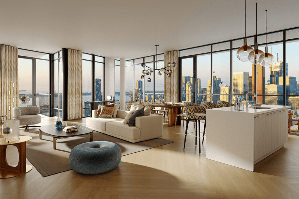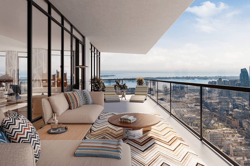 Las ventanas de piso a techo y los amplios balcones brindan impresionantes vistas panorámicas del horizonte de Toronto, enmarcando la ciudad en una composición pintoresca y armoniosa.