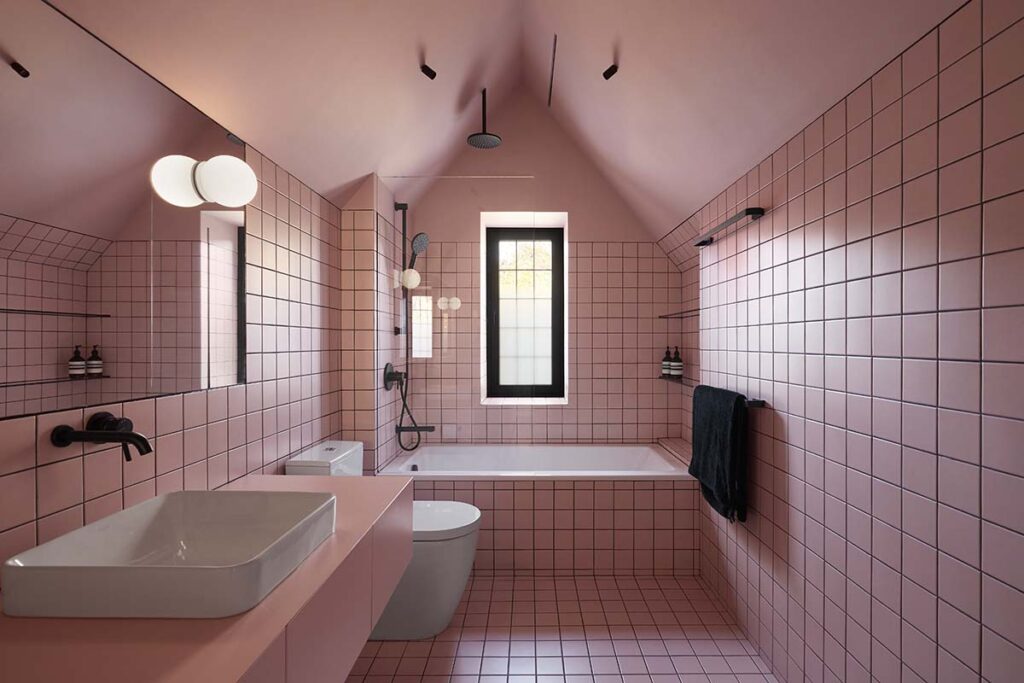 En el ático, escondido detrás de una puerta secreta, aparece un baño de color rosa brillante. Las paredes, los pisos, los techos e incluso las encimeras están adornados con baldosas de cerámica rosa, creando un ambiente divertido pero romántico. Este encantador espacio es motivo de alegría para el más pequeño de la familia, que tiene la suerte de ocuparlo.