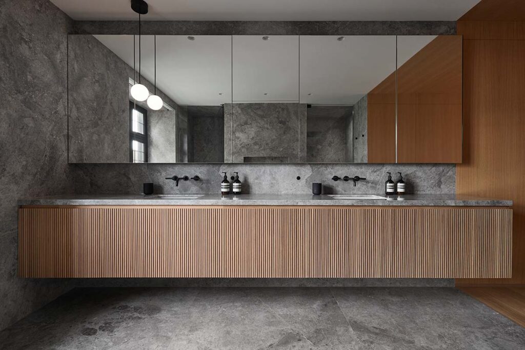 El baño cuenta con un gran tocador de roble blanco estriado, en armonía con el estilo delicado y refinado de la casa. Los gabinetes de pared reflejan la luz natural y hacen eco de la mampara de vidrio que conduce a la ducha.