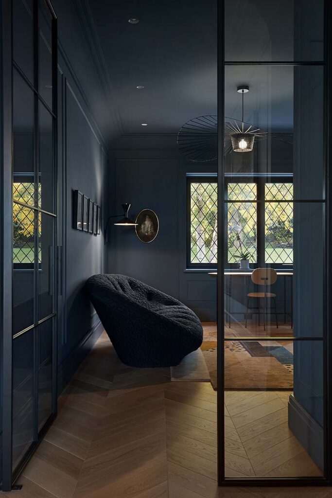 En el primer piso, la biblioteca, con su atrevido color azul marino, ofrece una experiencia inmersiva. Desde el techo y la madera hasta los pedestales y los muebles empotrados, el azul crea una atmósfera limpia y divertida, inspirada en la expresión danesa «hyggelig», que evoca una sensación de bienestar.