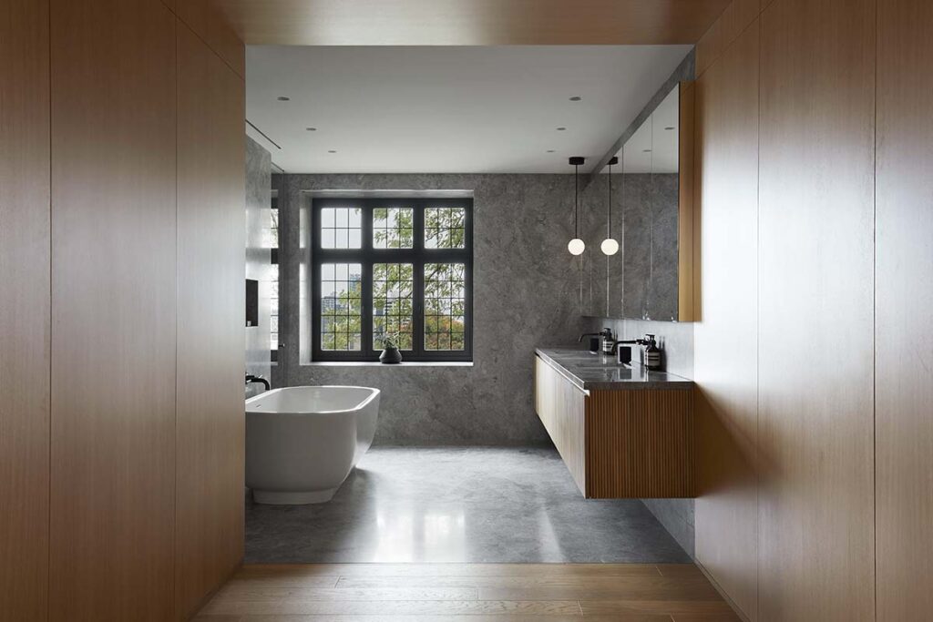 En el segundo piso, la suite principal es un remanso de paz, aislada del resto de la casa por una esclusa revestida de madera. Las paredes blancas del pasillo dan paso a la suavidad de los paneles de roble blanco y las losas de mármol esmerilado que revisten las paredes y el techo para lograr una elegancia monocromática.