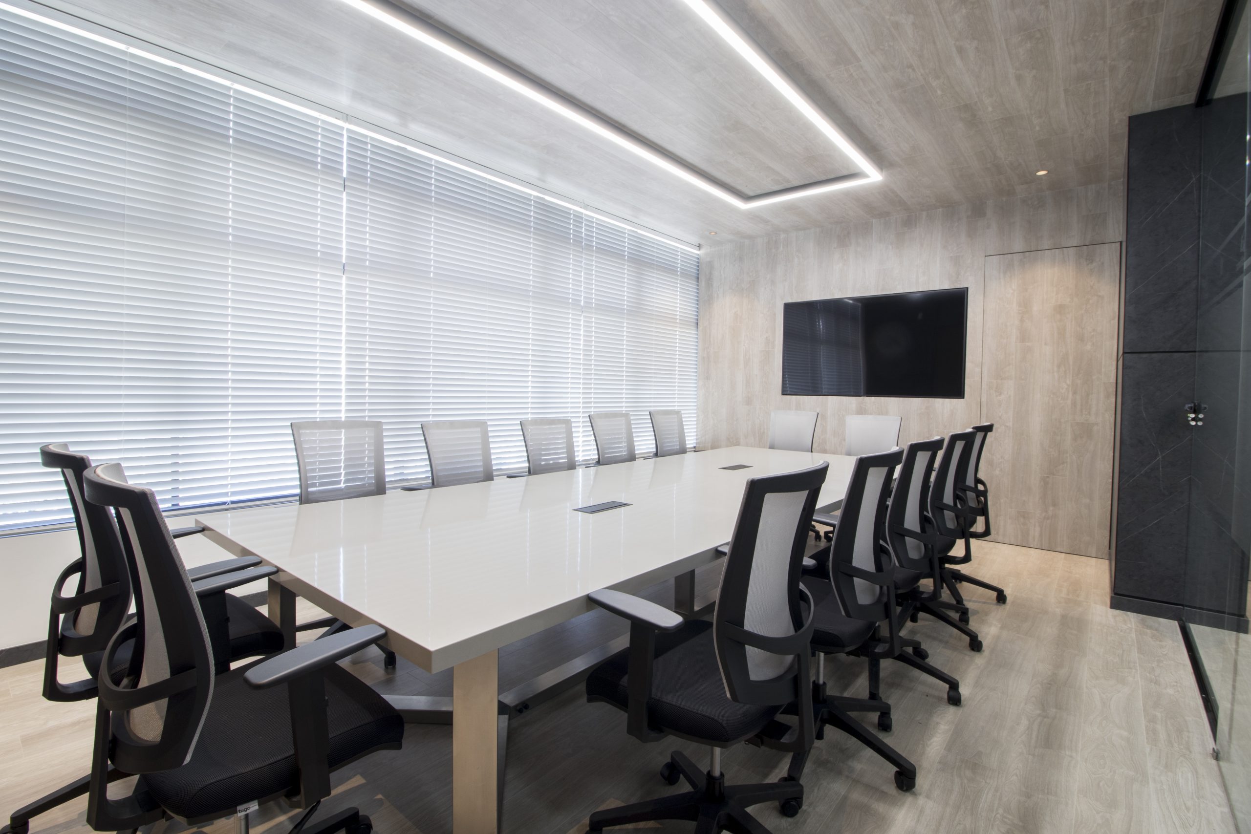 mesa de juntas con conectividad, sillas giratorias ergonómicas y un cerramiento en vidrio con perfilaría negra, generando un concepto de elegancia y sobriedad, que incluye tableros corredizos para integrarse a un segundo espacio con sillas y mesas clásicas de diseño con el propósito de compartir en reuniones alternas y más privadas.