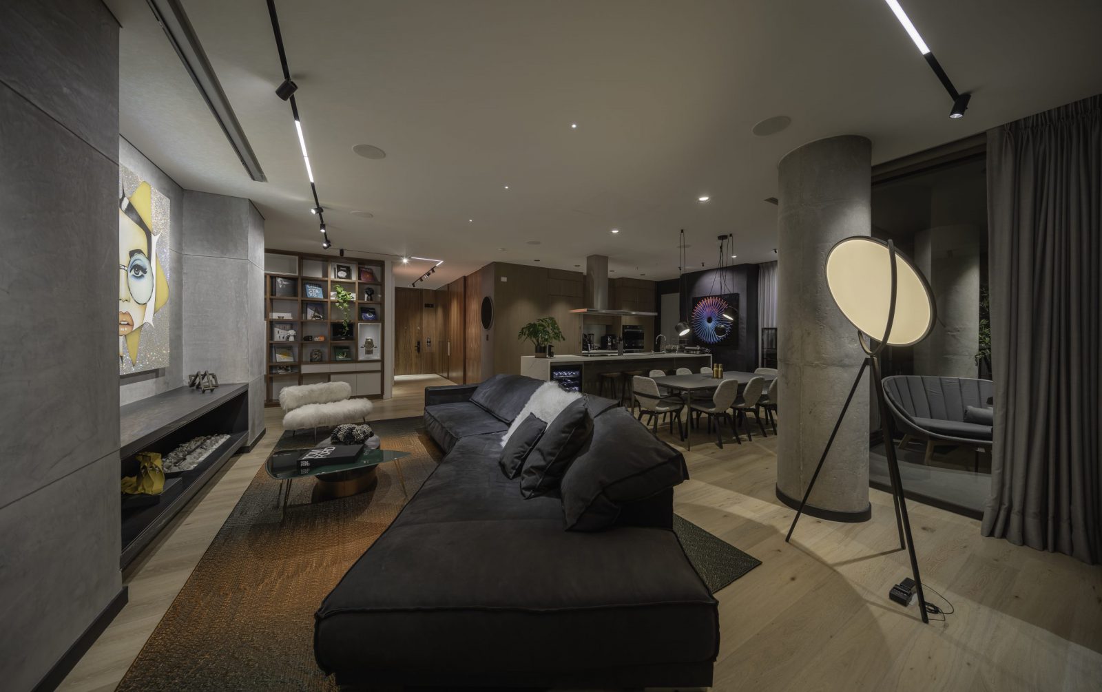 Ricardo Bejarano, propietario y diseñador del apartamento, contrató para el diseño de iluminación a Luis Miguel Aristizábal, arquitecto e interiorista líder de la línea Schaller Tech, quien creó una atmósfera cálida a través de distintos juegos de luz. “Empleamos un track arquitectónico rectilíneo de la marca Targetti como unificador del espacio interior, con líneas de luz y proyectores que empiezan en el vestíbulo y se extienden a lo largo de la circulación hasta la zona social”, explica Aristizábal.