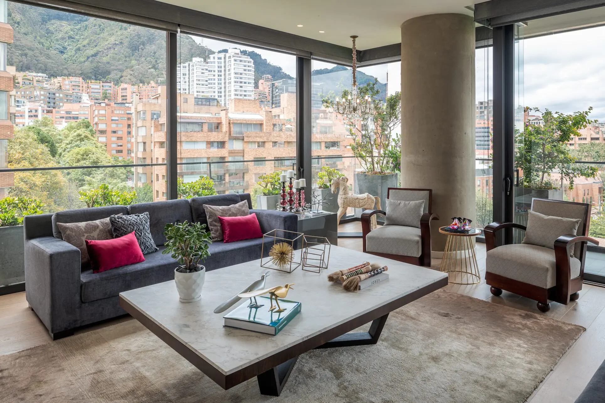 Ubicada en el barrio La Cabrera, norte de Bogotá, esta vivienda rinde homenaje a la calidez de los materiales y a la iluminación. La arquitectura del edificio estuvo a cargo de la firma inglesa Bogle Architects, y el diseño interior de las colombianas Octubre Arquitectura –Guillermo Arias– y Muebles&Co –Alejandro Sarasti–. El constructor, Nicolás Manrique, describe el proyecto para entender los conceptos clave: “El elemento alrededor del cual giró el diseño de los apartamentos fue la luz. En este sentido tomamos varias decisiones, como incluir ventanas piso-techo, que no solo permiten el paso del sol, sino que se conectan con terrazas ajardinadas”.