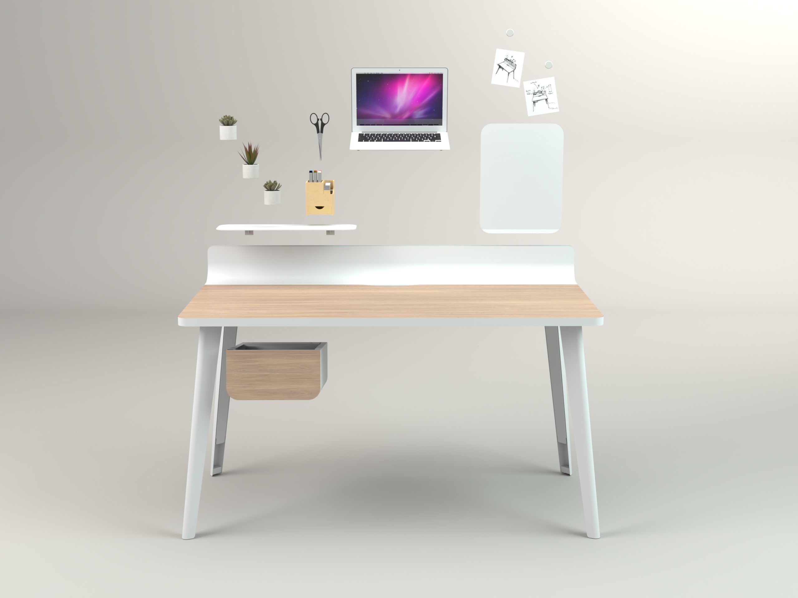 Respecto a la personalización, este diseño propone una repisa de metal, para ubicar desde una planta hasta fotos o una lámpara. “Al lado tienes un tablero metálico donde con unos imanes sostienes un horario, una lista de tareas, etc.”. Otro aspecto es el muro curvo en la parte trasera, que define el escritorio en sus dimensiones formal y funcional. “Es la base para personalizar y, además, evita la caída de objetos hacia atrás. Está hecho a partir de dos láminas de metal que permiten poner distintos elementos, es un pequeño contenedor de libretas, sobres y esferos; también sirve para videoconferencia al sostener allí un teléfono o una tableta”.