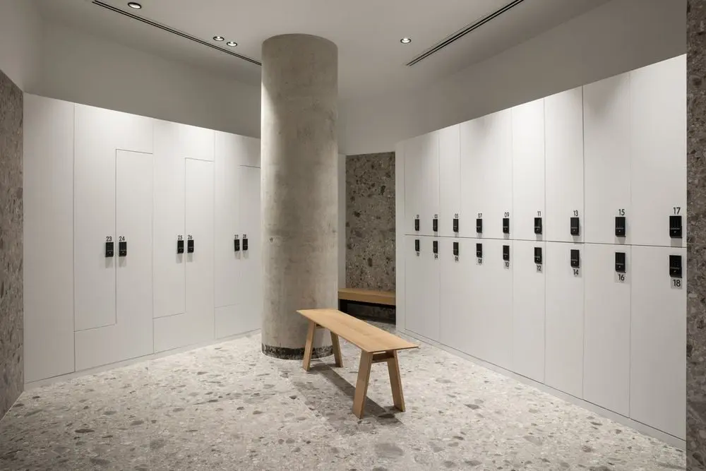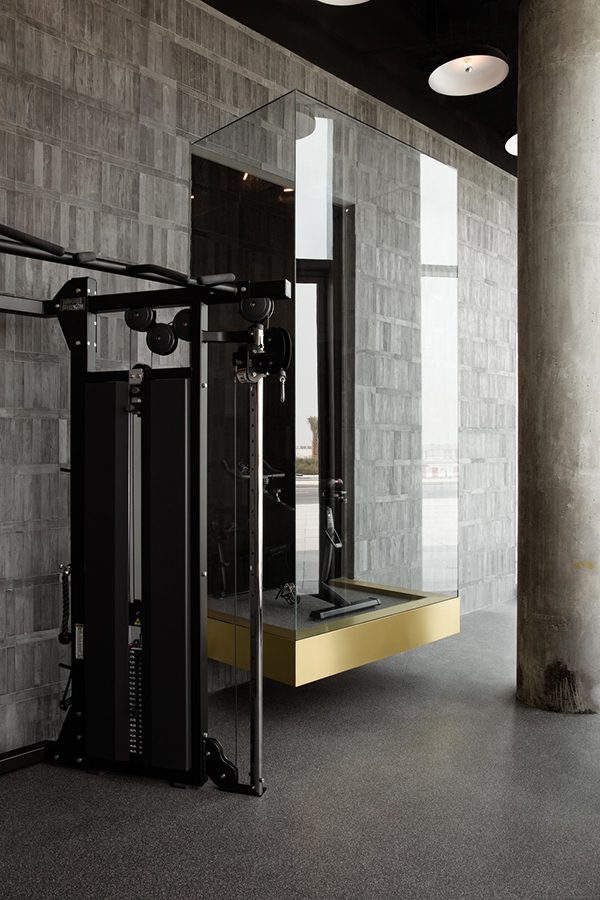 Inspirado por el brutalismo en la arquitectura y los clubes clandestinos de lucha, VSHD estaba decidido a abstenerse de usar los materiales habituales que se encuentran en la mayoría de los clubes de salud. Los arquitectos utilizaron materiales –no en el léxico de los espacios modernos contemporáneos– como ladrillos de hormigón combinados con aleación de oro y cobre para que se vean actuales, mientras que, al mismo tiempo, crean modos que son elegantes y cálidos. Luz LED suspendida y personalizada utilizada para ocultar todos los servicios de techo mantiene un ambiente de iluminación vibrante que puede ser controlado por las diferentes zonas de ejercicio.