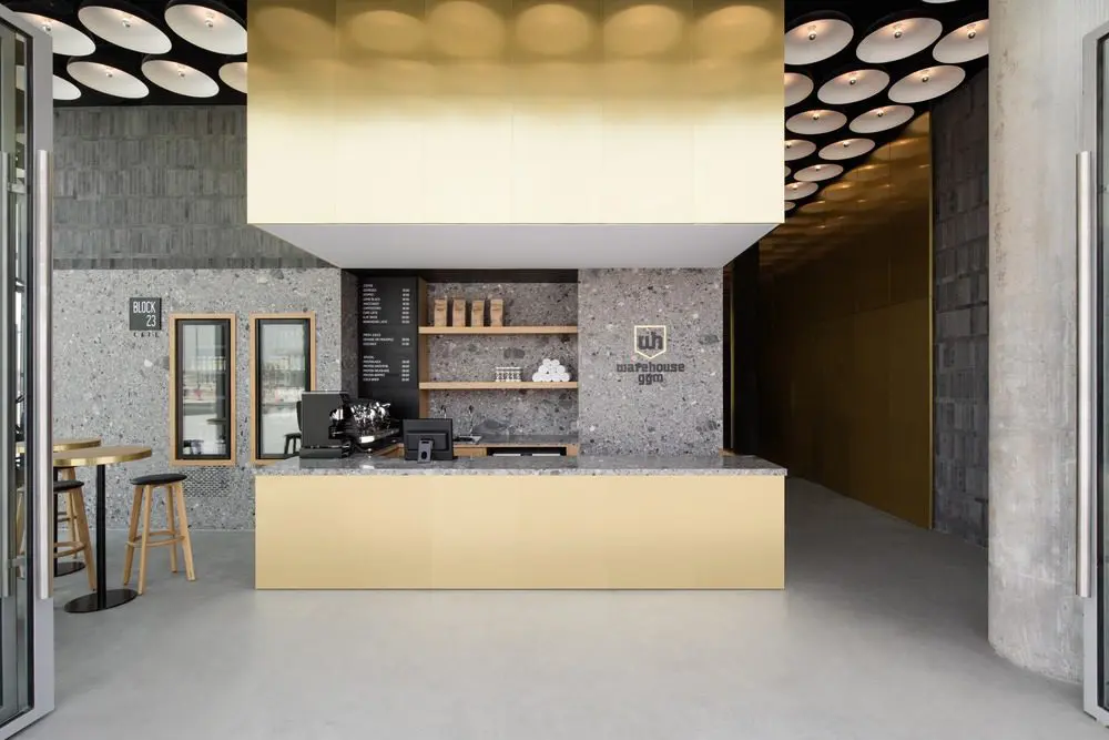 El Warehouse Gym en D3 está ubicado en la entrada principal del distrito con vistas desde dos calles principales, para esto, era esencial que el diseño capitalizara la vista desde la calle para atraer a nuevos miembros de la comunidad de expertos en diseño. La recepción / bar de zumos se diseñó como un espacio comunitario con una fachada de vidrio de 17 metros de largo en la calle principal, creando un punto de encuentro para la comunidad de diseño donde pueden reunirse después de su entrenamiento diario o para que los no miembros puedan pasar y tomar un batido o ensalada saludable mientras experimenta el ambiente del gimnasio